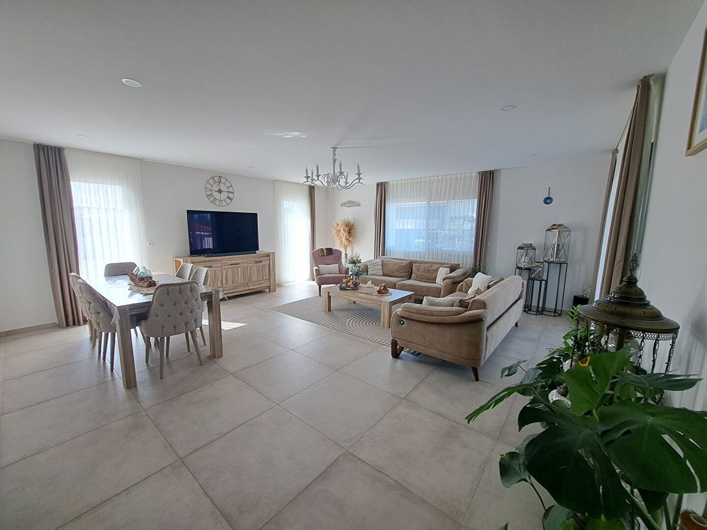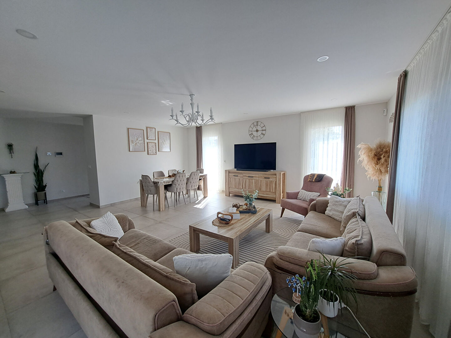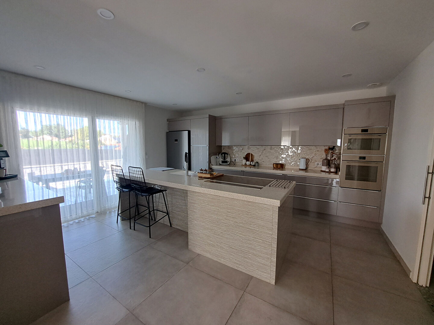 - Une grande pièce de vie lumineuse avec une cuisine moderne,