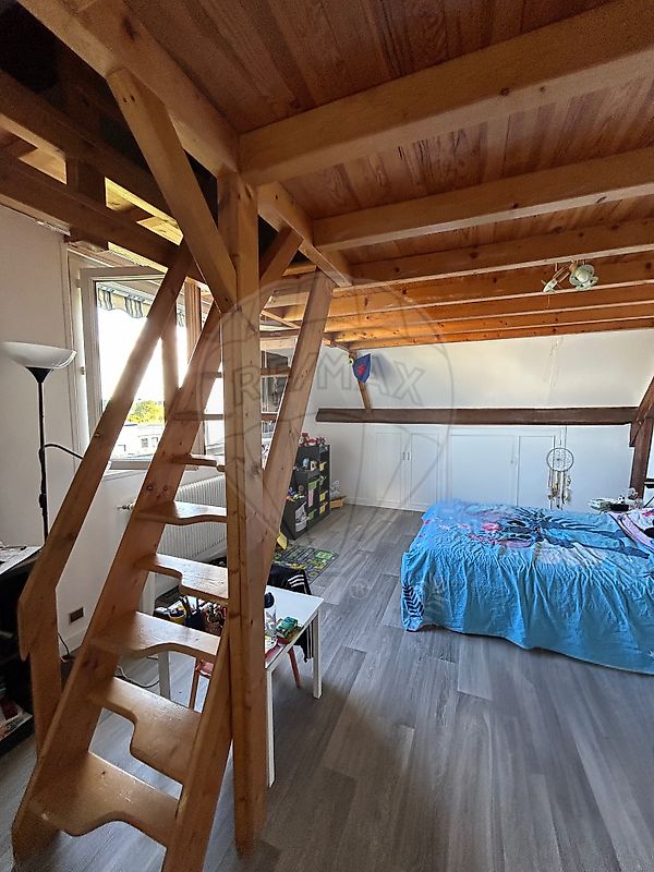 <p><strong>- à l'étage : un palier avec rangement donnant accès à une chambre avec sa salle d'eau privative, à une autre chambre avec un bel espace mezzanine et un WC.</strong>