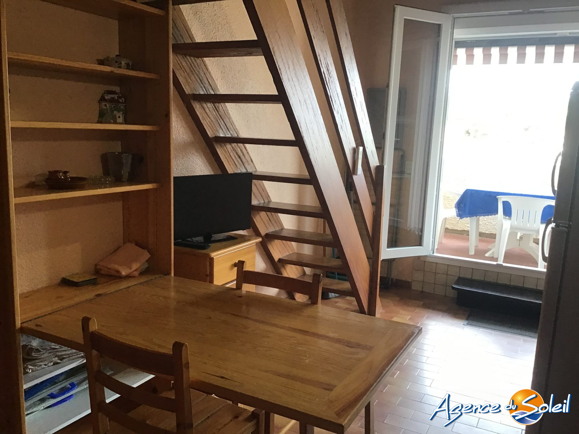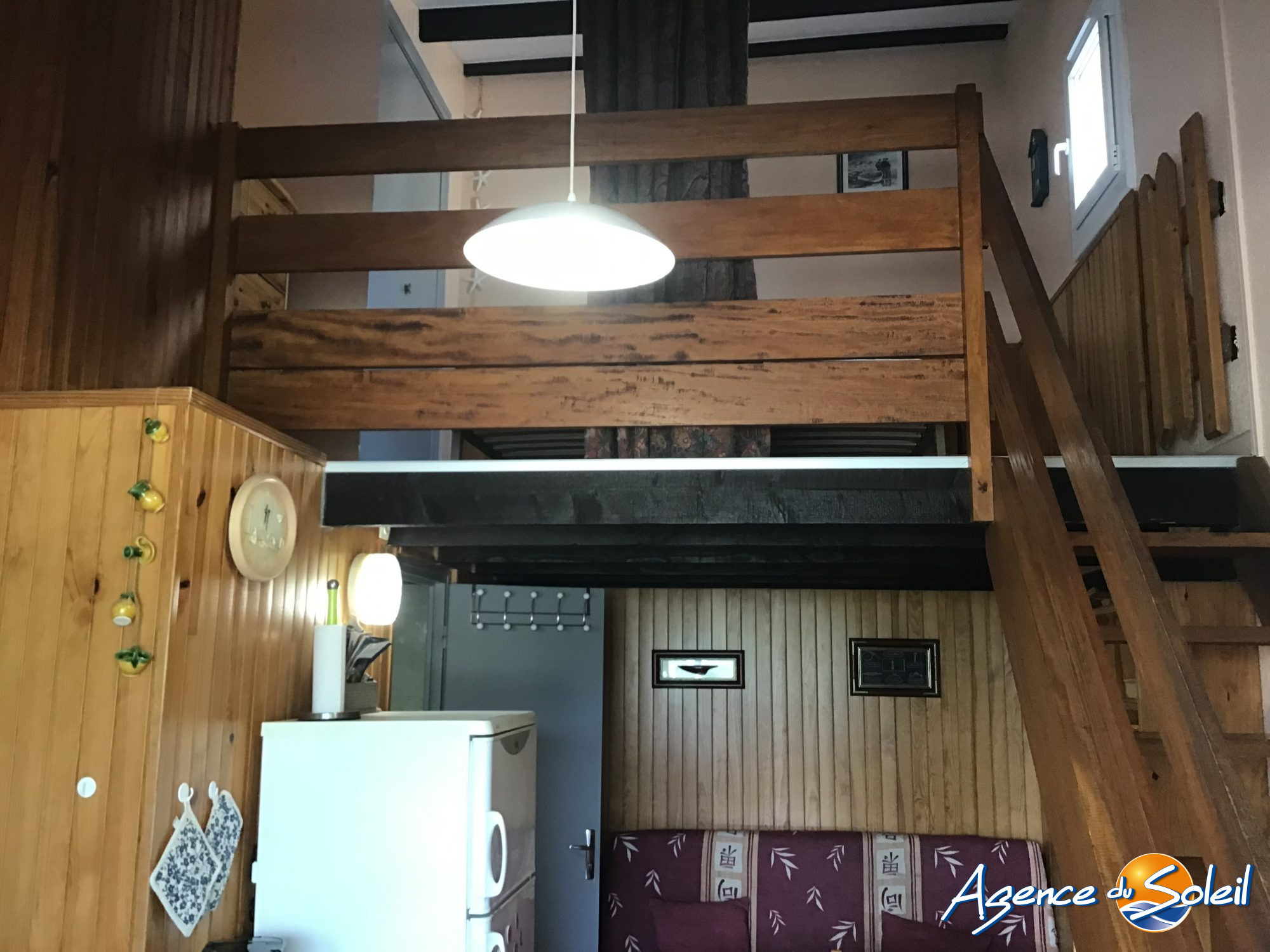 Pièce à vivre avec cuisine en accès direct sur la terrasse. Belle chambre en mezzanine.
