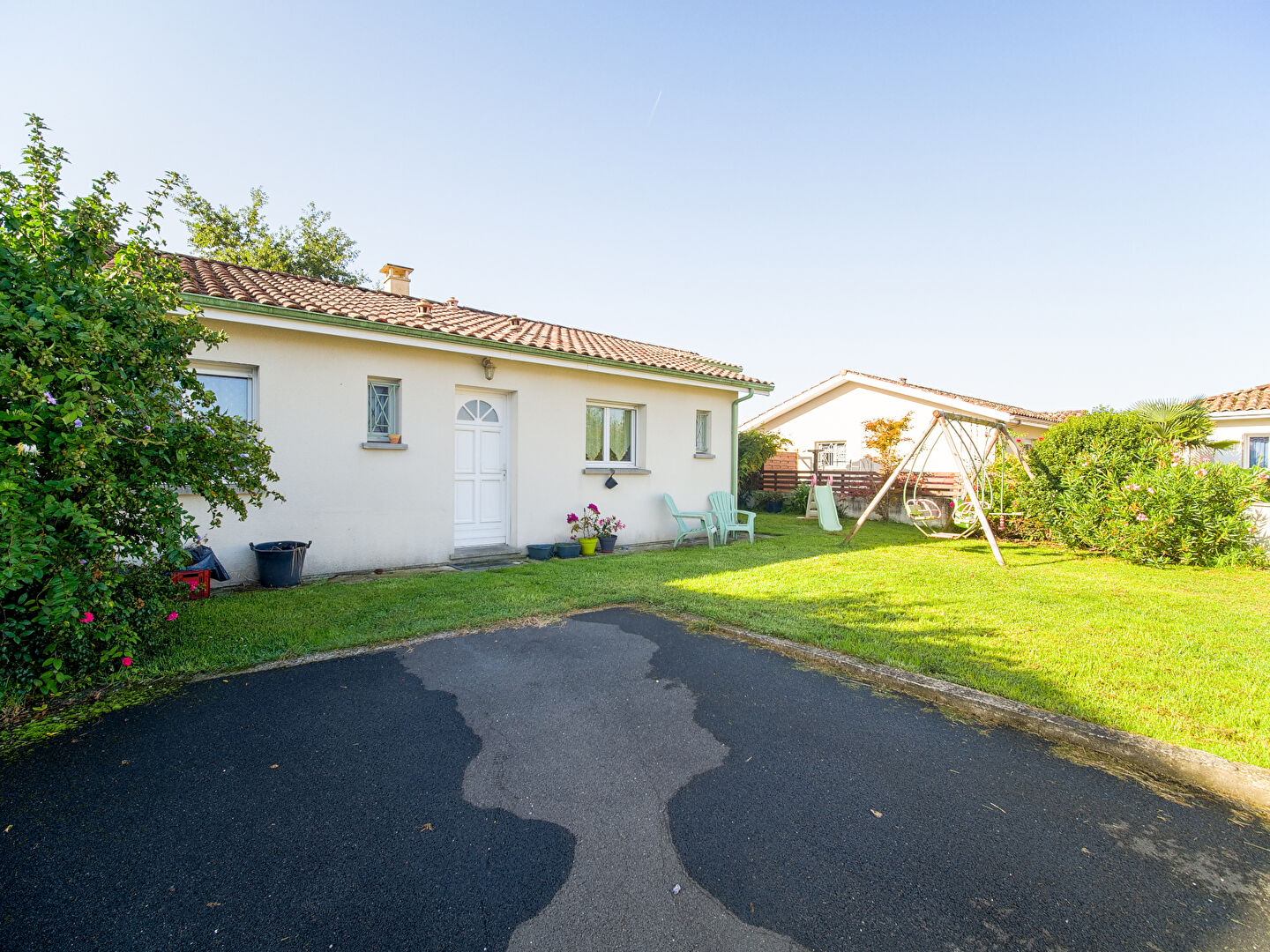 Coté extérieur, un terrain de plus de 300 m² vous attend, avec portail électrique, place goudronnée, et terrasse côté sud.