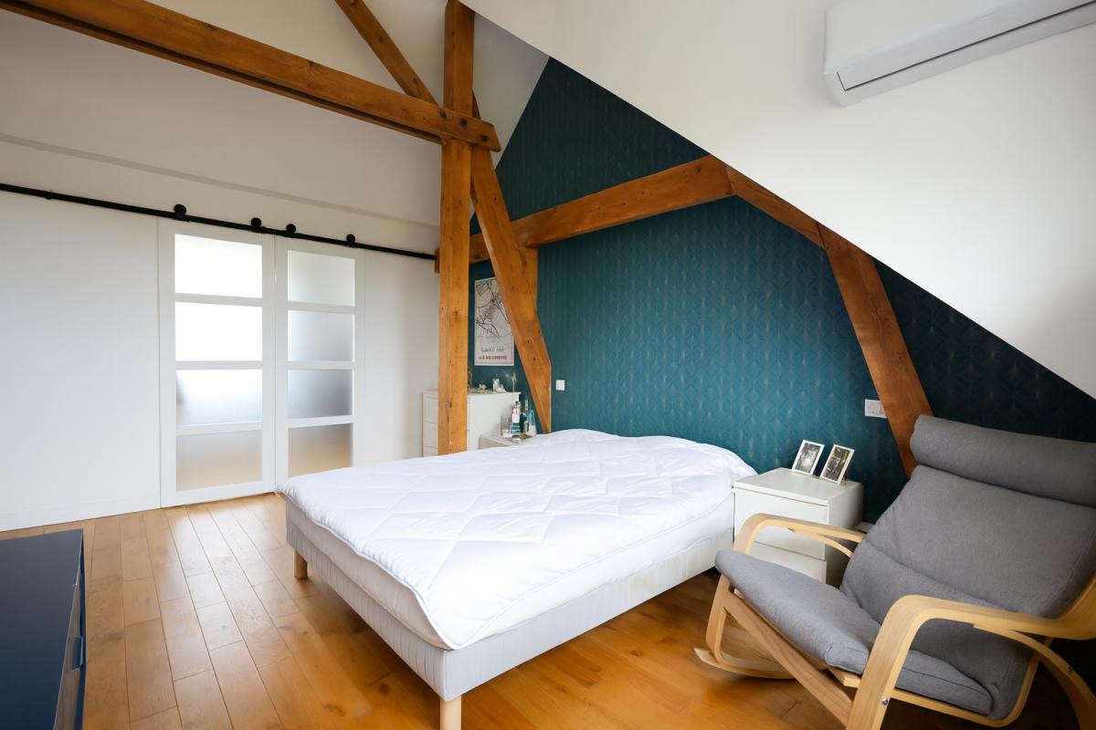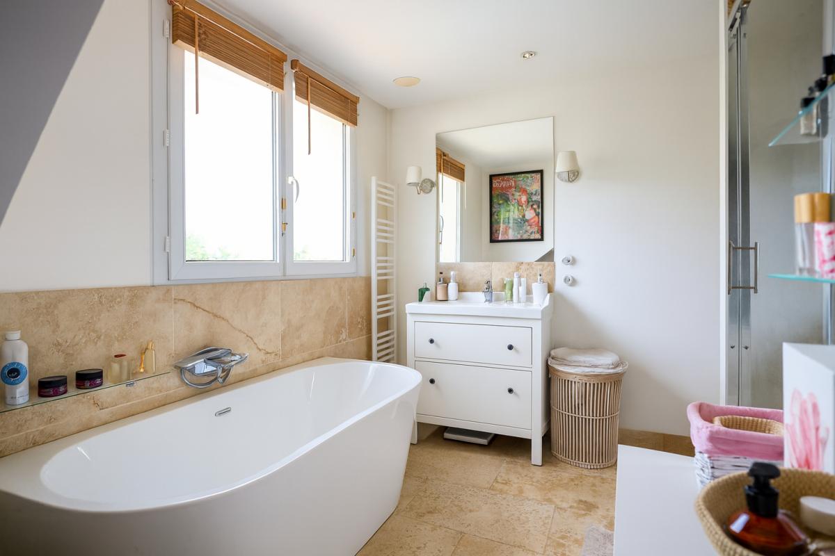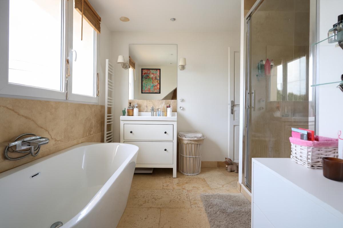 A l'étage, un palier mène à deux chambres confortables, chacune avec dressing, ainsi qu'à une salle de bain familiale équipée d'une baignoire, d'une douche et de WC.