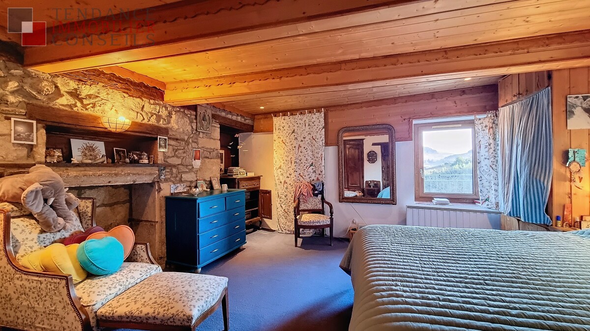 Vous profiterez sous ce premier niveau d'une grande chambre (20m2) avec balcon, d'un salon de 31m2 avec sa magnifique cheminée en pierre, d'un espace salle d'eau, d'un bar et une deuxièmes entrée qui fait office de cellier.