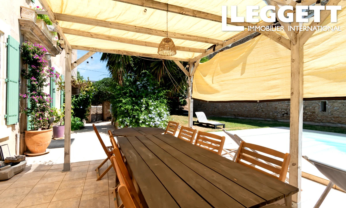 Le jardin paysager de 365 m² offre terrasses, pergolas, coin barbecue, cabanon, puits et piscine (8x4 m). Un art de vivre unique dans le Sud.