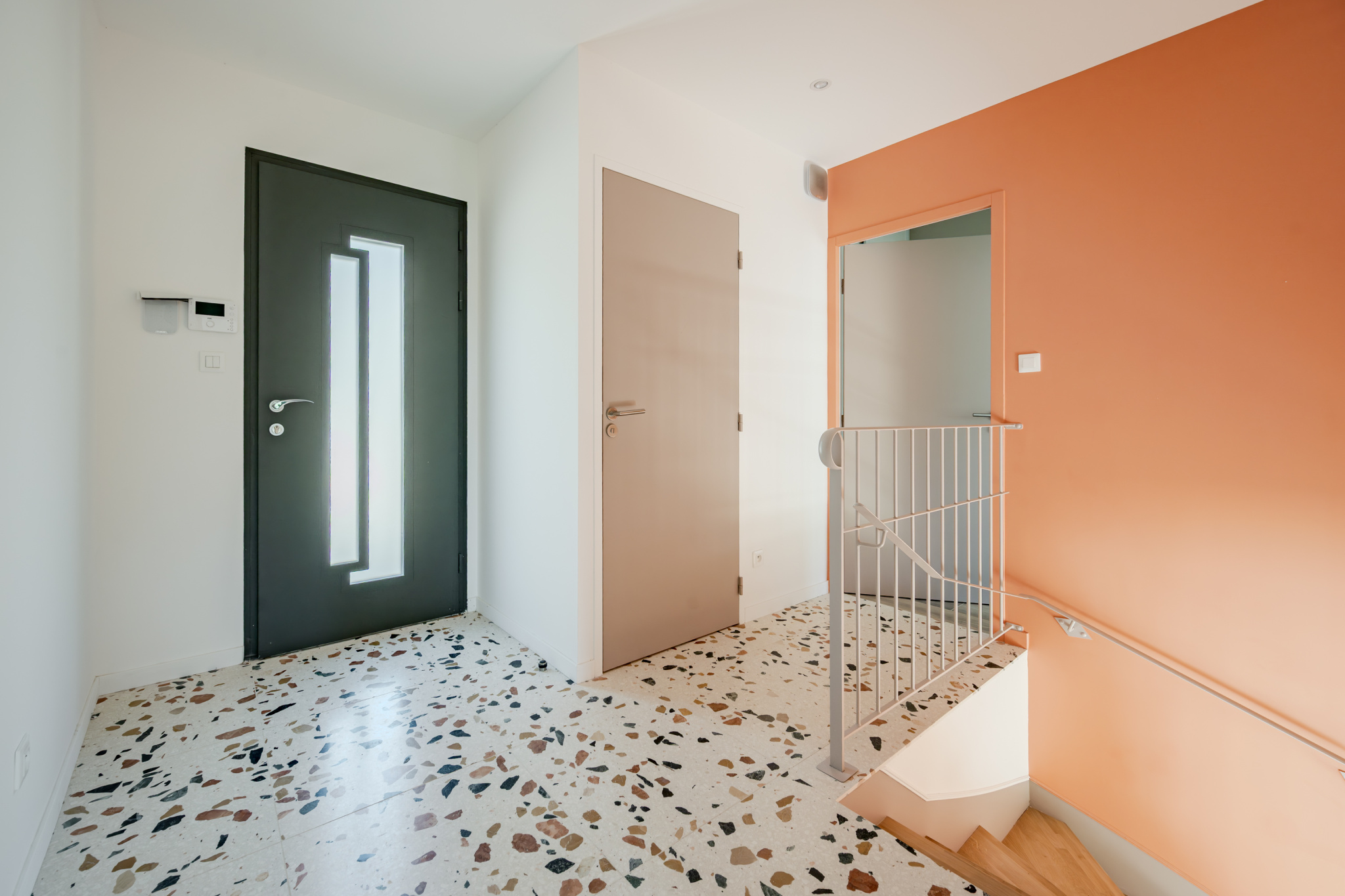 Conçue avec un soin particulier, elle s'ouvre sur une entrée qui dessert le premier niveau comprenant deux chambres de 18m2 et 26m2, chacune dotée de leur propre salle d'eau profitent d'une vue dégagée. Un WC indépendant ainsi qu'un garage de 17m2 viennent compléter ce niveau.