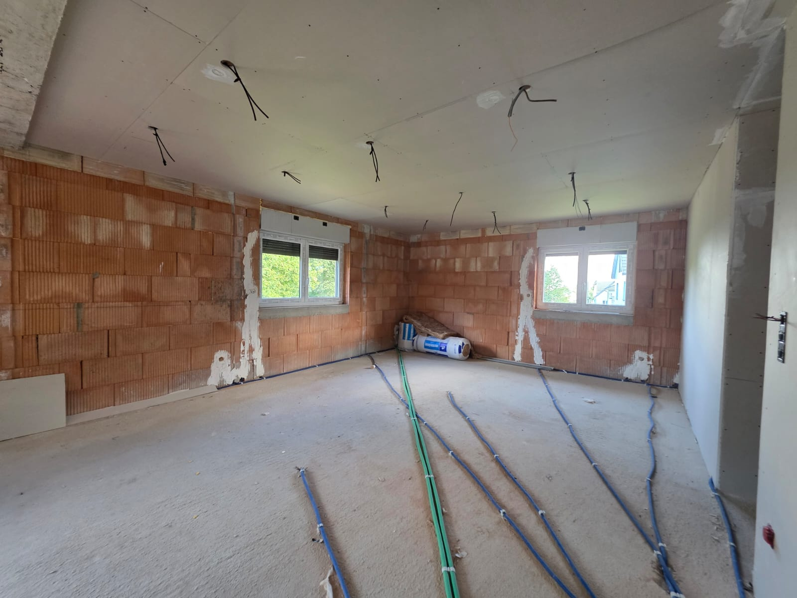 A prévoir : plâtrerie, isolation, électricité, chauffage, sanitaire, menuiseries intérieure, crépis (sous-couche effectuée), chapes et isolant, carrelage, serrurerie, peintures, cuisine, aménagements extérieurs...