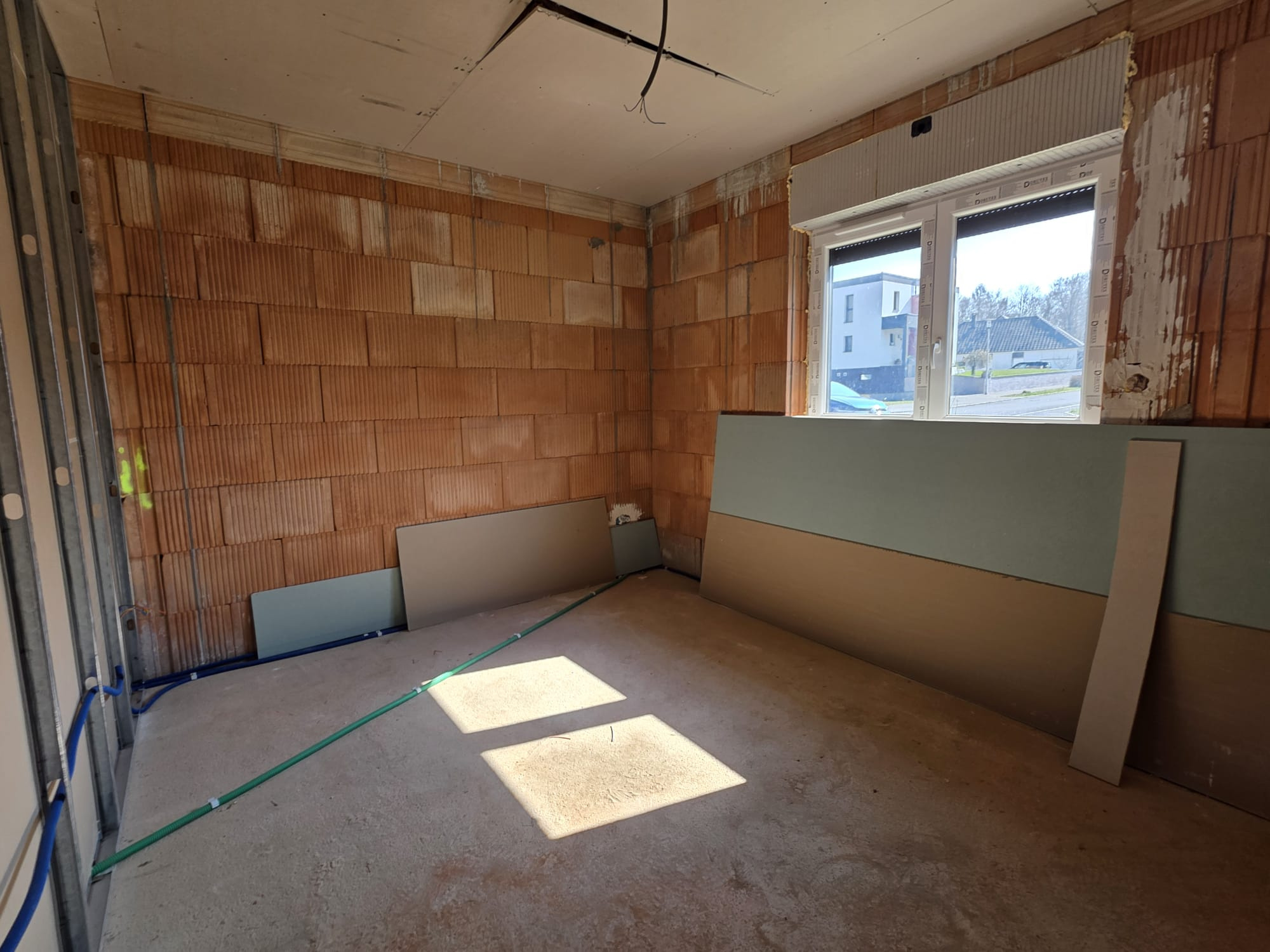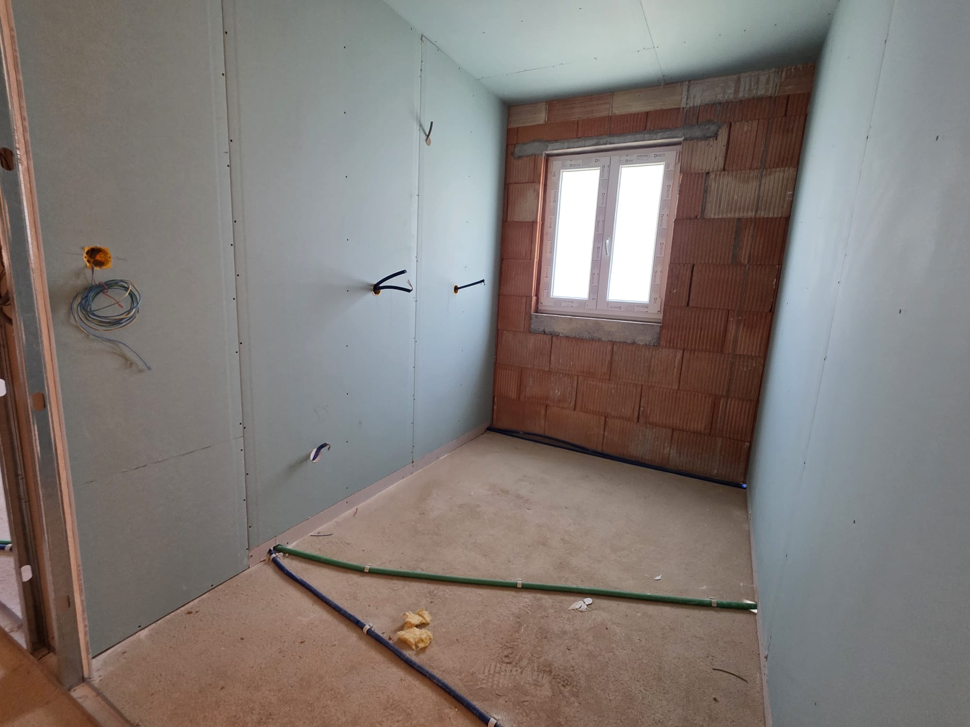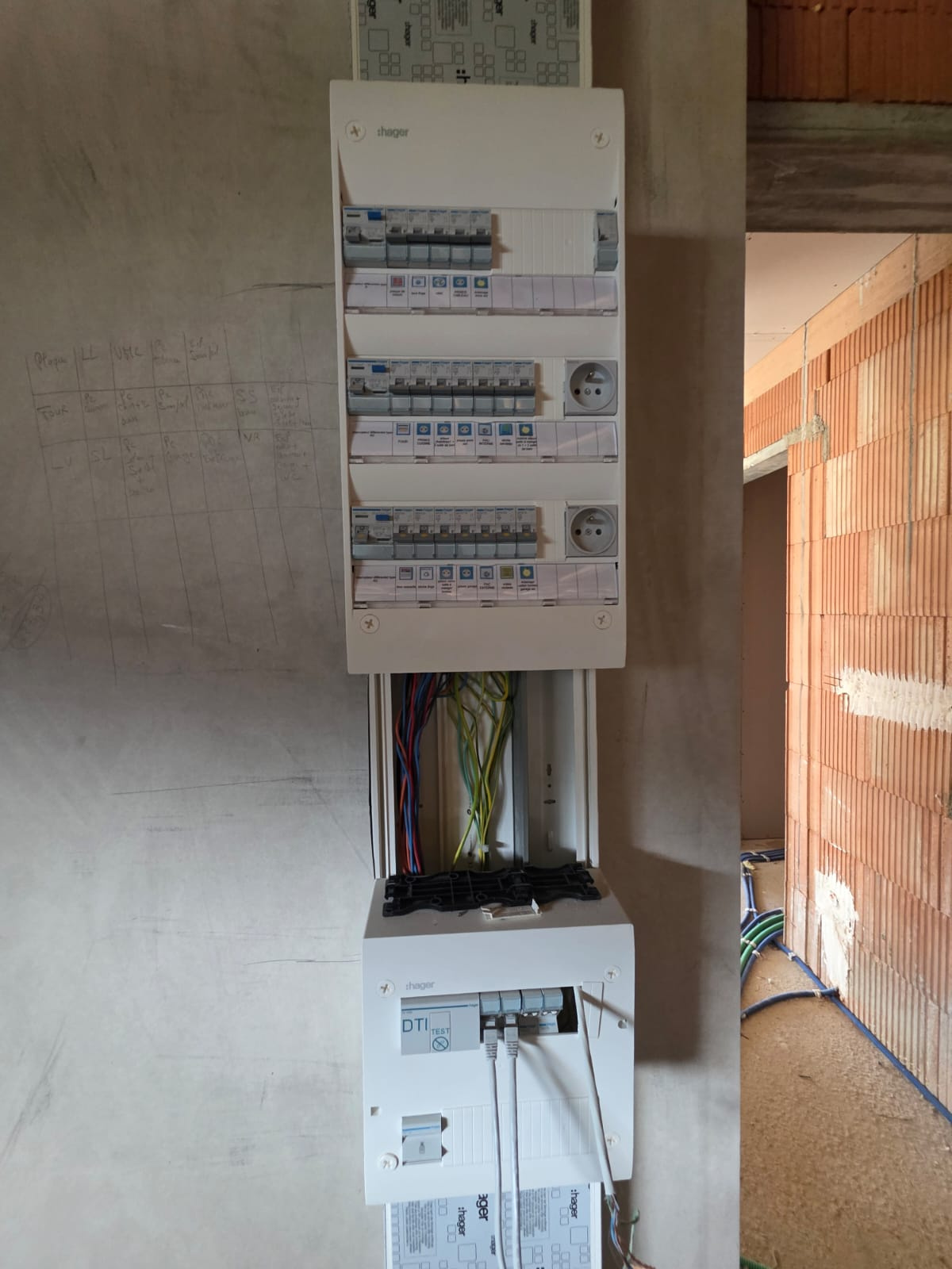 Le gros oeuvre est déjà réalisé : la toiture est achevée, les menuiseries extérieures (portes et fenêtres) sont installées, et les réseaux sont en attente. Une grande partie de l'installation électrique est en place, incluant un tableau Hager déjà posé, ce qui constitue un réel avantage pour la poursuite des travaux.