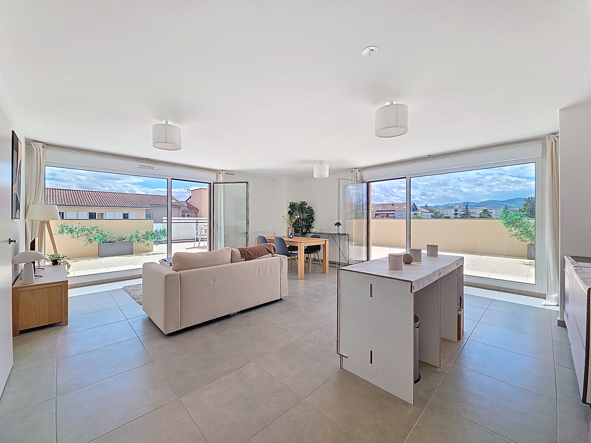 Ce bien se compose d'un vaste séjour avec cuisine ouverte, baigné de lumière, donnant accès à une exceptionnelle terrasse de 82 m2 exposée sud-ouest. Un véritable espace extérieur à vivre, idéal pour vos moments de détente ou pour recevoir en toute convivialité.