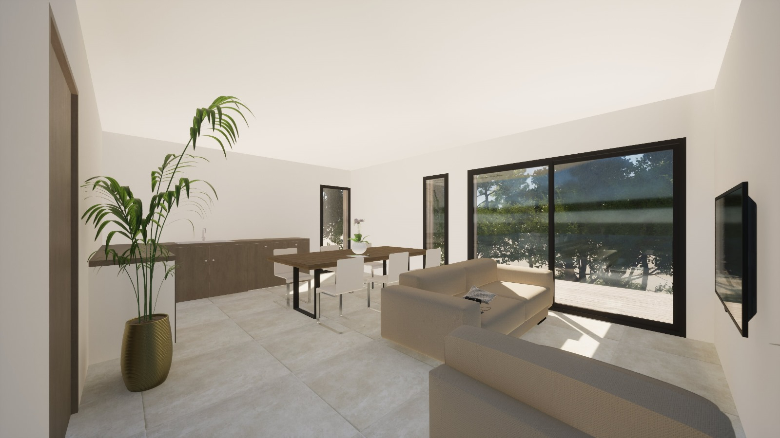 Très belles prestations : menuiseries aluminium/PVC, volets roulants électriques, placards aménagés, carrelage 60×60 et parquet stratifié, peinture lisse et garde-corps en aluminium ou en verre.