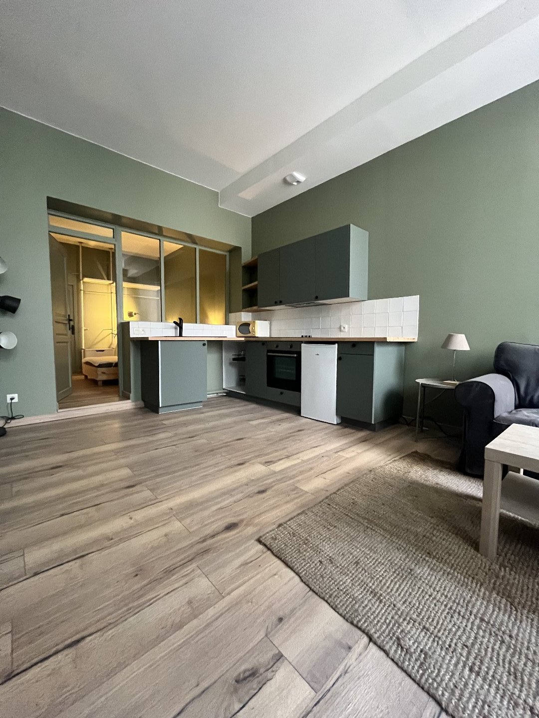 Bordeaux, en plein coeur des Chartrons, dans un immeuble en pierre, appartement T2, cuisine ouverte sur le séjour lumineux, chambre, une salle d'eau.