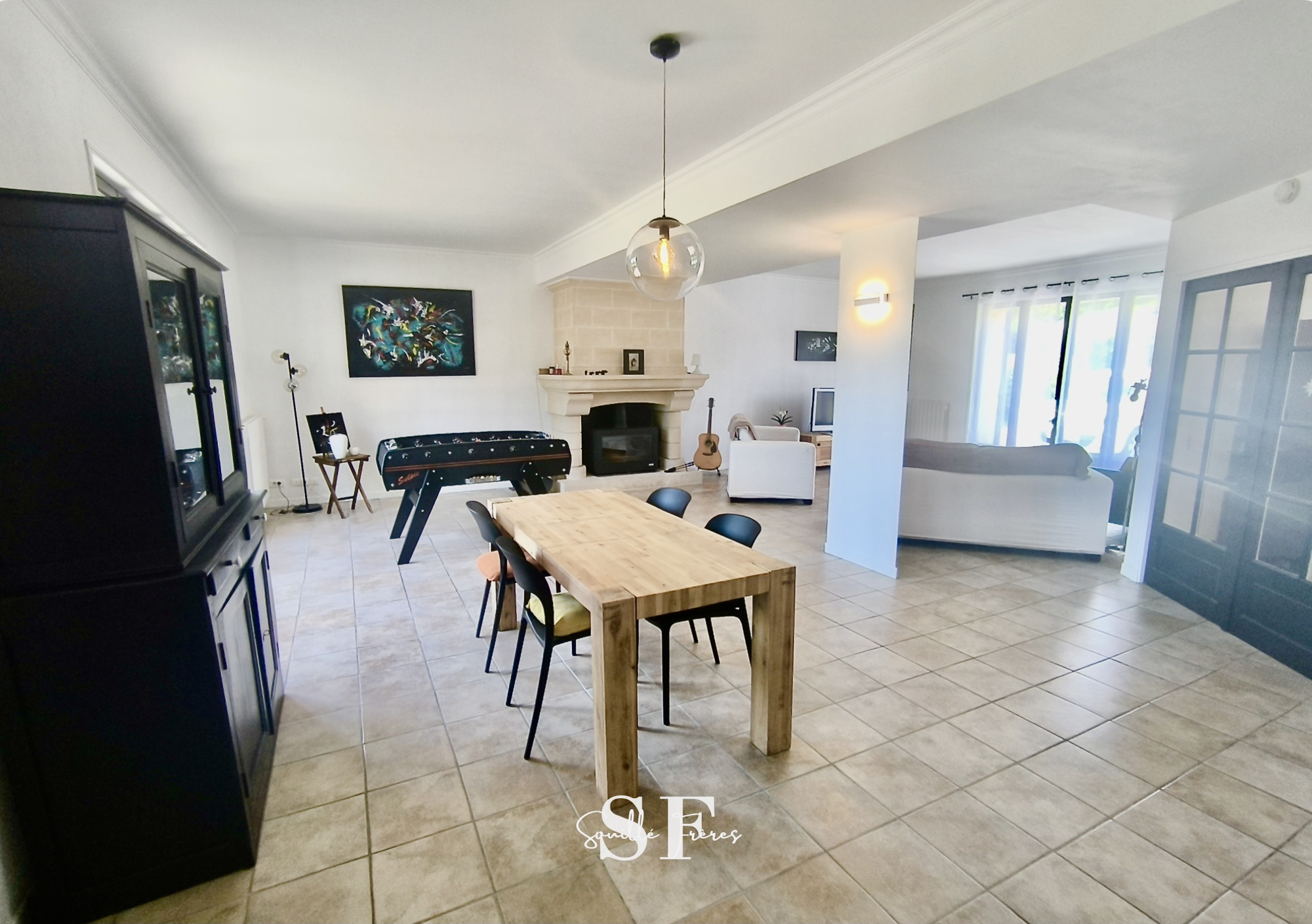 La maison principale de 265m2 environ offre une vaste entrée,un wc avec point d'eau, une cuisine avec une authentique cheminée en pierre, attenante à celle ci: la buanderie ainsi que le cellier. Un salon-séjour de plus de 60m2 avec poêle à bois, lumineux et donnant accès direct sur terrasse et jardin.