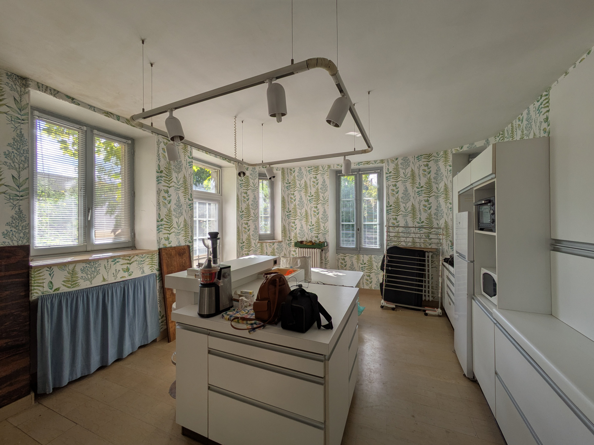 -en rez-de-chaussée : une cuisine lumineuse de 23m2 entièrement équipée, un séjour de 19m2 puis un salon de 11.5m2 avec accès jardin, un couloir de dégagement menant à une salle de bains, un WC, et une 1ère chambre de 11.7m2. Au niveau inférieur se trouve une belle cave voutée.