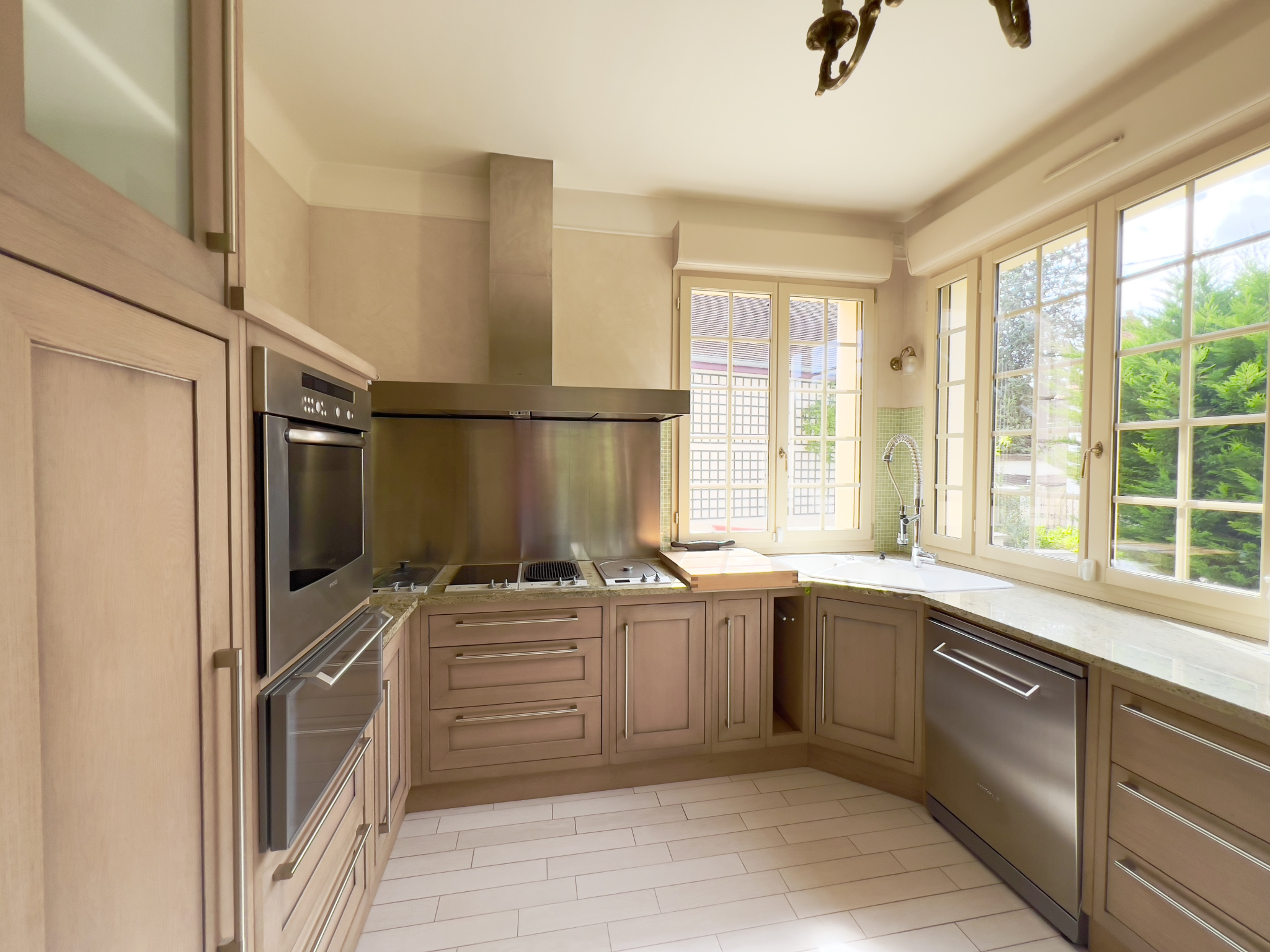 Le rez-de-jardin entièrement aménagé : salle de cinéma, bureau, cuisine séparée aménagée et équipée, salle de bains avec hammam, WC séparés avec lave-mains, local technique.