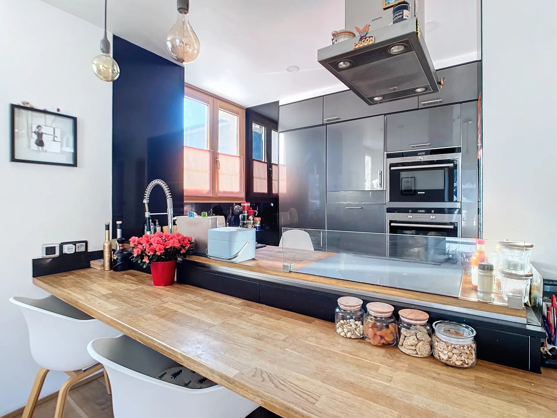 Dans une maison chamoniarde typique des années 1920, au calme du centre ville, un apartement, 1er étage, balcon vue Mont-Blanc et tout le massif, une chambre parentale avec salle de bains, deux chambres, une salle de bains, une cuisine moderne, à 4 minutes à pied du centre ville de Chamonix et des rémontées mécaniques du Brévent, une grande cave, exposition plein sud avec 3 orientations d'est en ouest, parking, ascenseur.