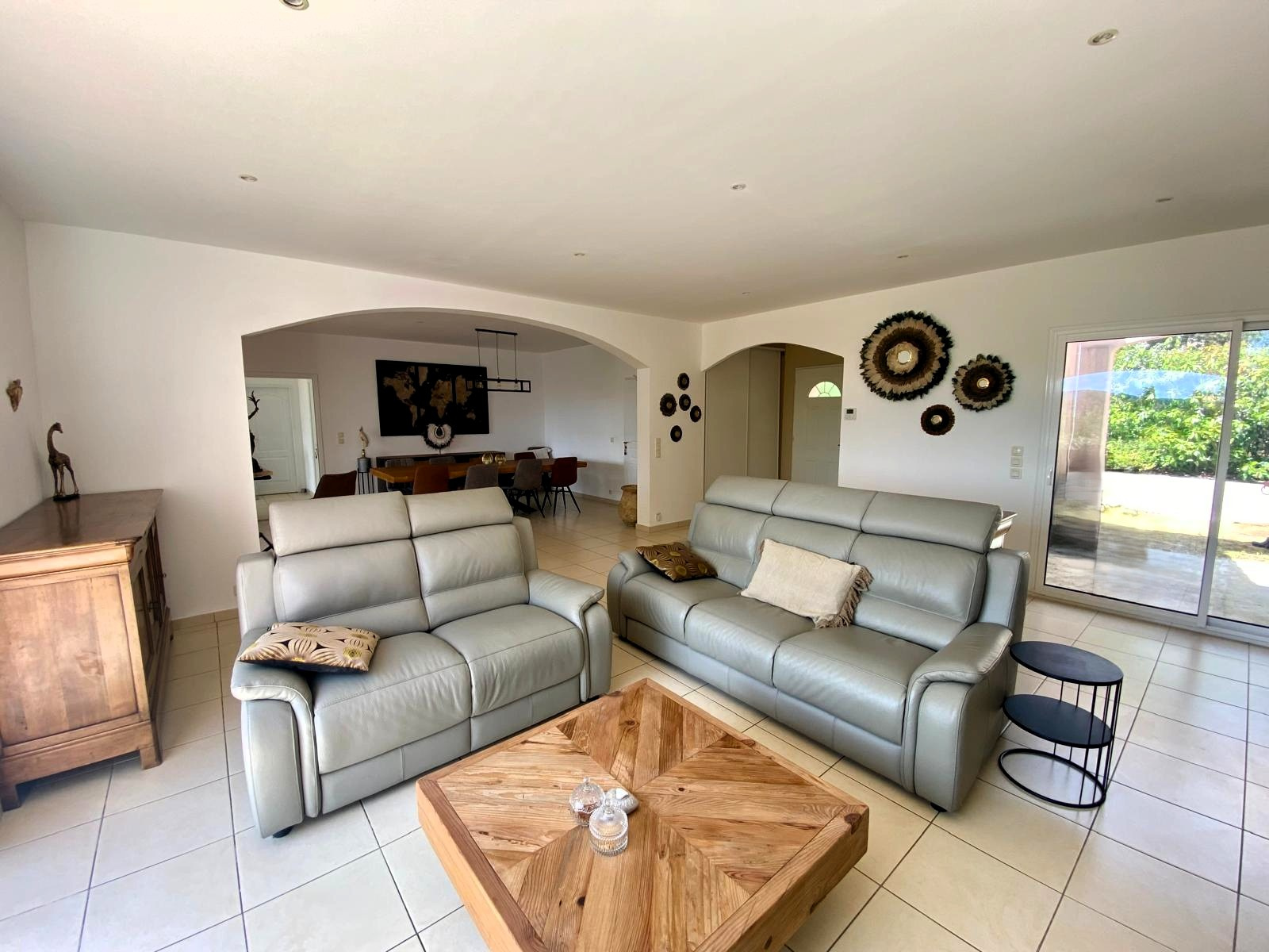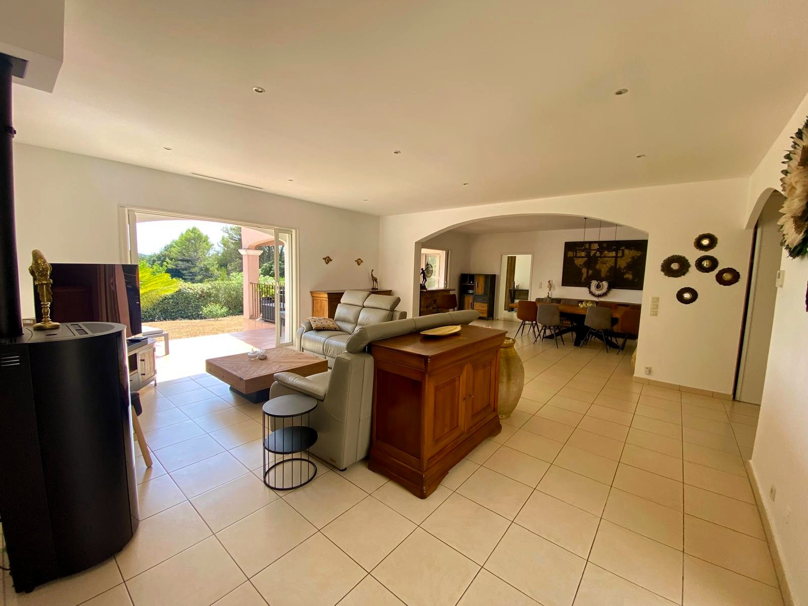 EXCLUSIVITÉ - Située à Bagnols-en-Forêt, cette villa 5 Pièces de plain-pied de 188 m2, construite en 2008 sur un terrain plat et arboré de 2 185 m2, est en excellent état et ne nécessite aucun travaux. Elle s'articule autour d'une vaste pièce de vie lumineuse, équipée d'un poêle à granulés et d'une climatisation réversible, garantissant un confort optimal toute l'année. La cuisine fermée, entièrement équipée, dispose d'un cellier attenant. Dès l'entrée, un WC invités apporte une touche de praticité supplémentaire. Un bureau indépendant vient compléter la partie jour. Côté nuit, la maison offre trois chambres, chacune avec sa propre salle d'eau privative et équipée de climatisation, pour le confort et l'intimité de chacun. À l'extérieur, vous profiterez d'un jardin plat agrémenté d'un coin potager. Un abri voiture pouvant être fermé ainsi que plusieurs stationnements complètent les prestations. Une villa spacieuse, fonctionnelle et chaleureuse, idéale pour une vie familiale au calme. Taxe Foncière de 2154EUR