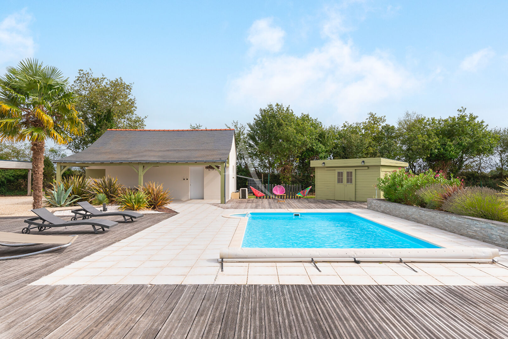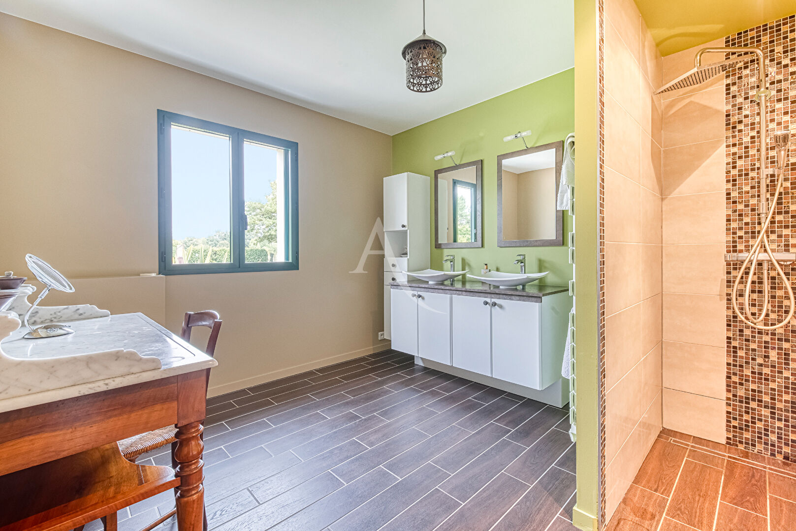 À l'extérieur, le terrain paysagé et clos vous garantit calme et intimité. La piscine chauffée, parfaitement intégrée à l'environnement, promet de longs moments de détente tout au long de l'année. La terrasse plein sud, accessible depuis le séjour, invite à la relaxation et aux repas en plein air dans un cadre verdoyant. Un garage double avec sa porte motorisée, un préau et un double carport viennent compléter les extérieurs.