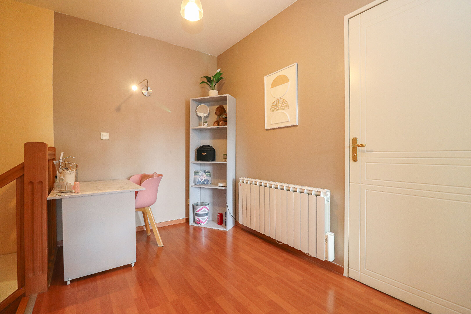 À l'étage, un large palier pouvant faire office de bureau dessert deux chambres toutes deux dotées de rangements intégrés, une seconde salle de bains, et un second WC indépendant.