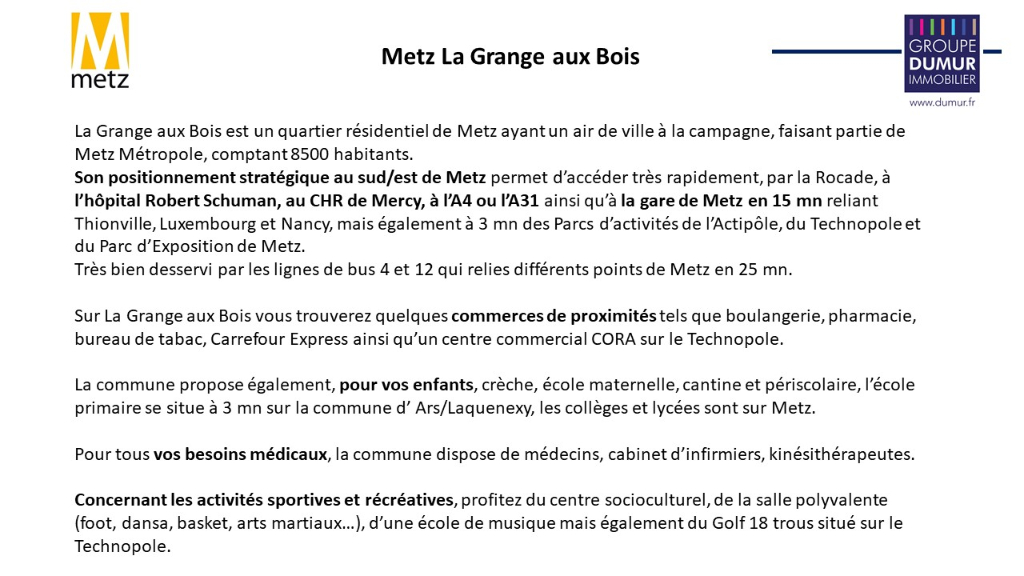 À seulement 15 minutes du centre-ville et de la gare de Metz, ce secteur bénéficie d'une demande locative soutenue grâce à sa proximité des axes autoroutiers, des commerces, des transports en commun et de l'hôpital de Mercy.