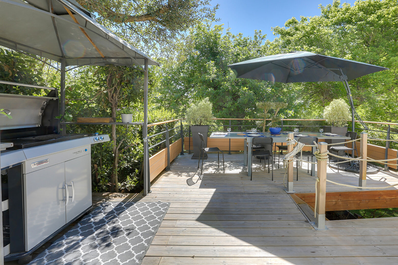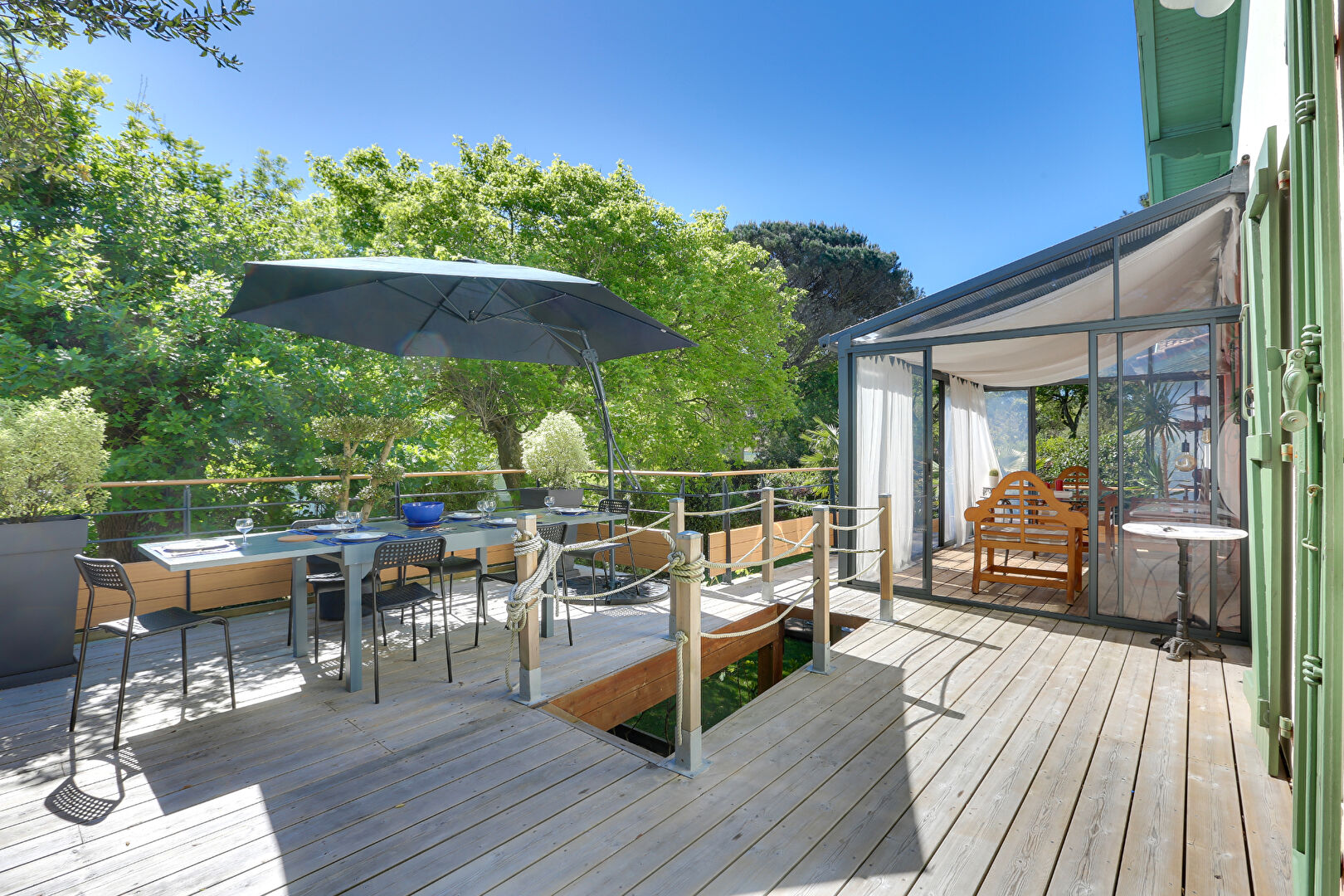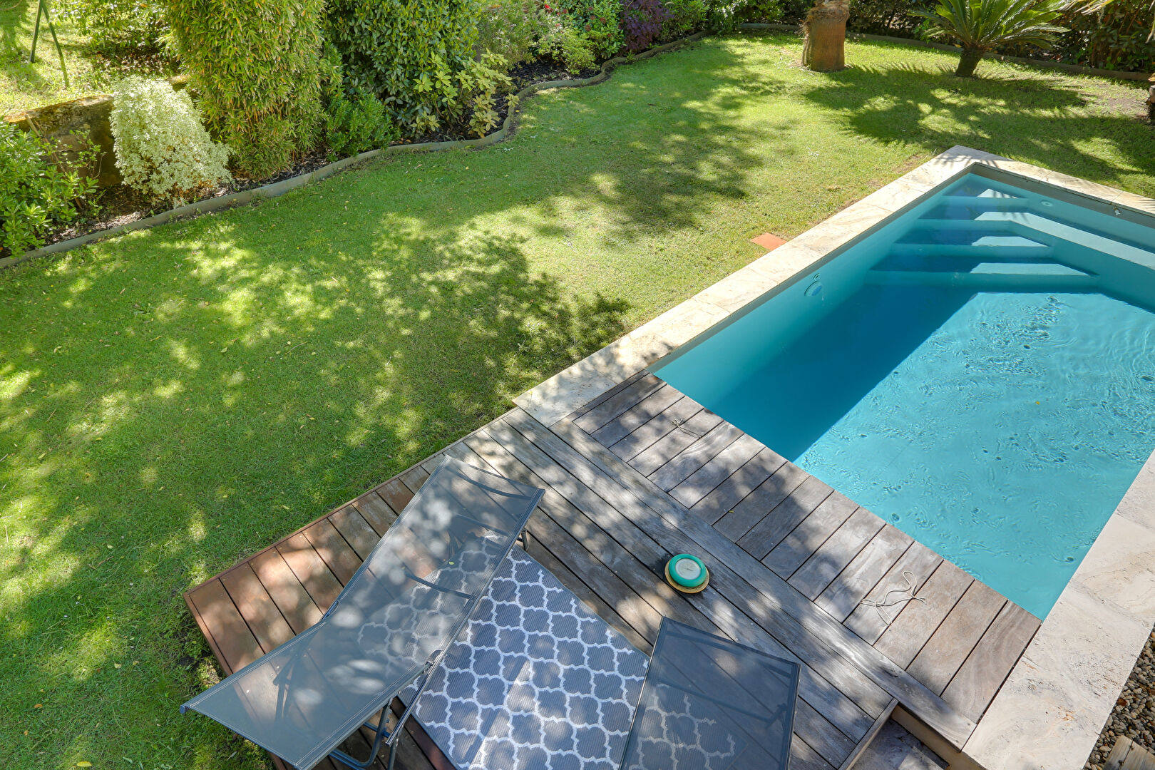 Côté extérieur, une grande terrasse en bois, dominante et surplombant le jardin de 601 m². Une piscine au sel de 7x2.5 et chauffée, avec une régulation automatique du PH, arrosage automatique avec forage pour un minimum d'entretien.