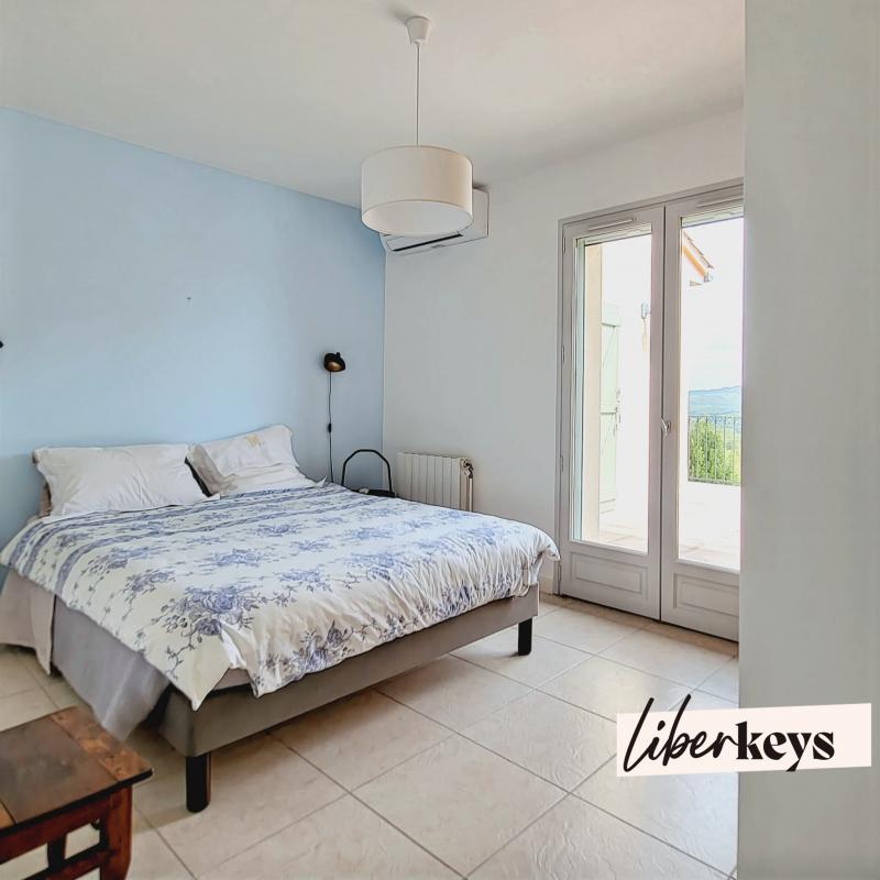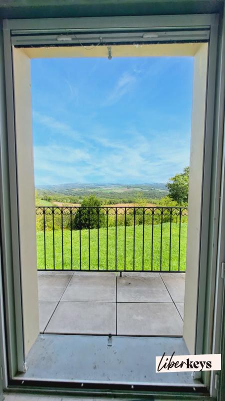Grande terrasse avec vue panoramique sur la campagne et accès direct au jardin et à la piscine