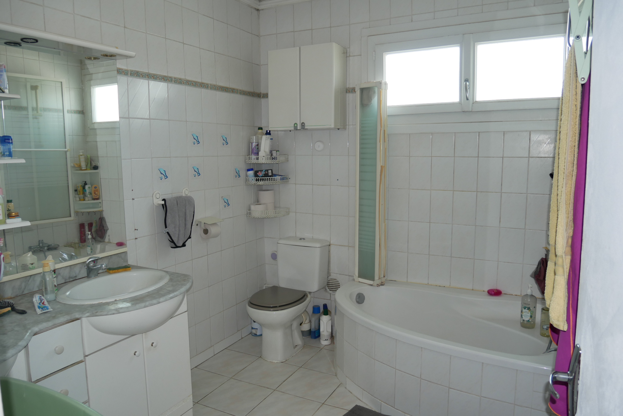 La maison se compose, au premier étage, d'un hall d'entrée, d'une cuisine fermée, d'un séjour salle à manger lumineux, d'un dégagement menant à deux chambres et une salle de bains avec WC.