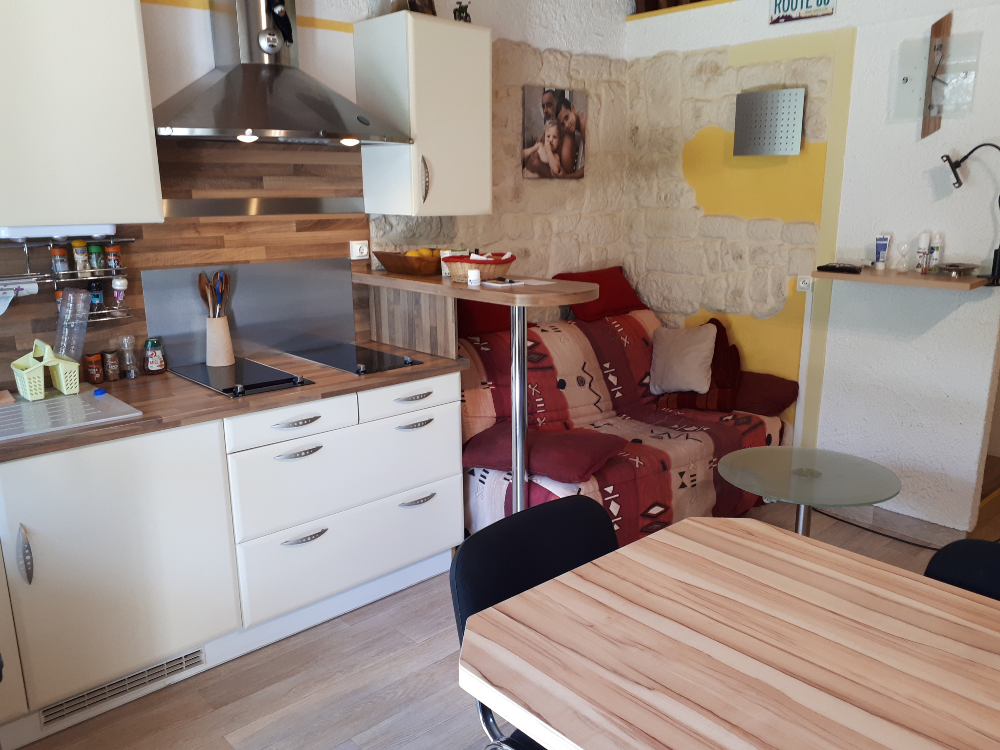 Ce T2 de 33 m2 au sol (28 m2 Carrez dû aux mansardes de la mezzanine), vous offre un séjour / salle à manger avec canapé convertible et cuisine ouverte tout équipée, un cellier avec rangements, une salle d'eau avec douche et WC. A l'étage, une mezzanine faisant office de chambre avec lit double (possibilité d'agrandissement de la mezzanine).