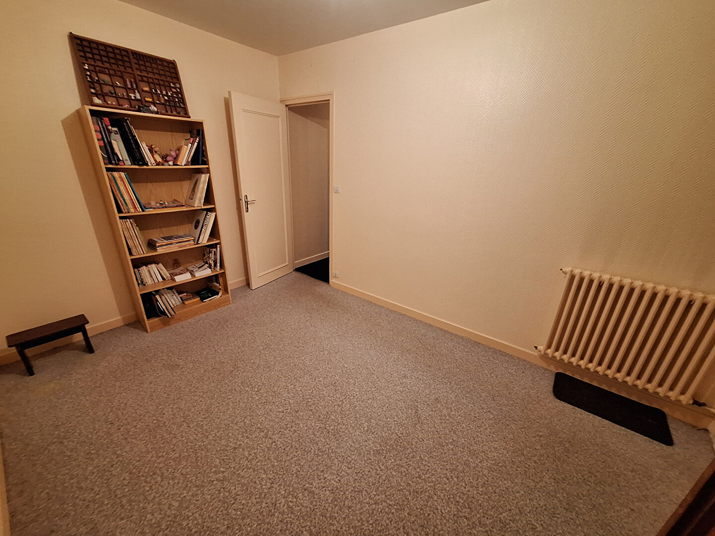 entrée, bureau, salon, salle à manger, cuisine, dégagement avec placards, deux chambres, salle de bains, toilettes.