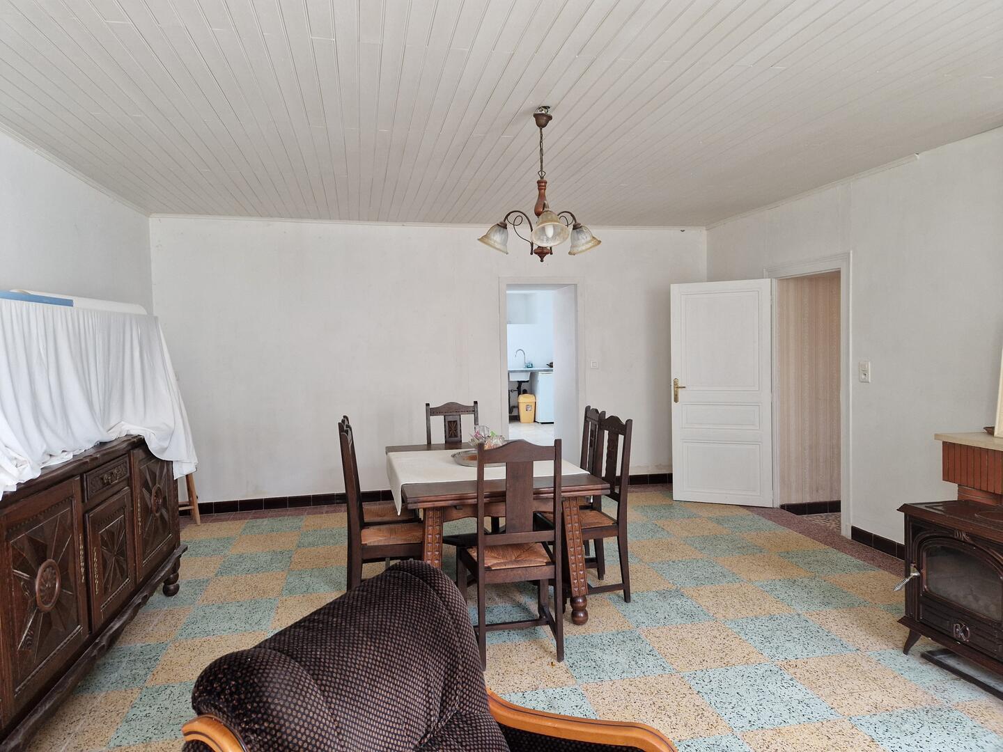 Comprenant: entrée, séjour de 34m², cuisine équipée de 27 m², cellier, deux chambres, salle d'eau, wc, chaufferie.