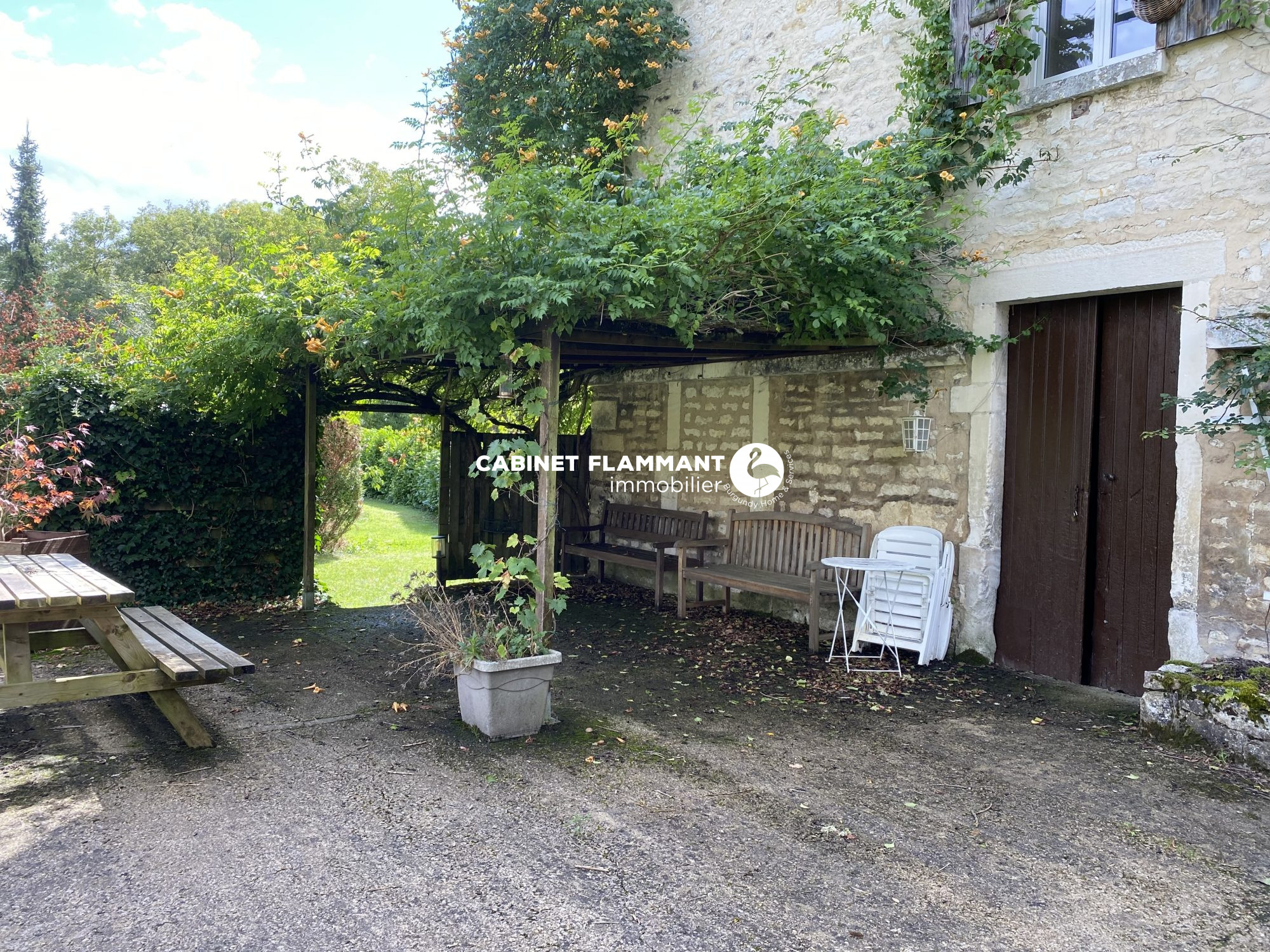 Très bel emplacement avec une grande terrasse à l'arrière de la propriété arborée, une partie est en tonnelle (possibilité de garder une piscine hors sol).