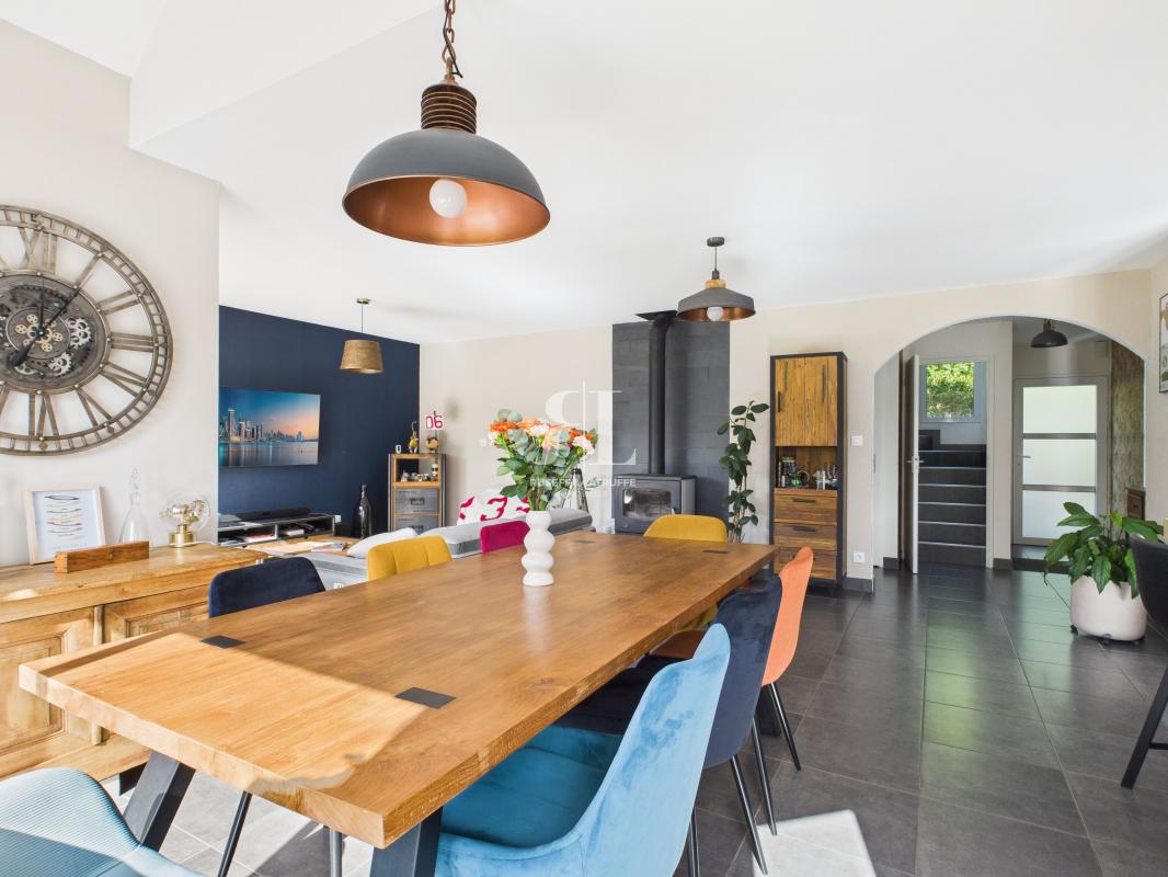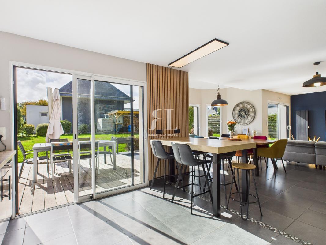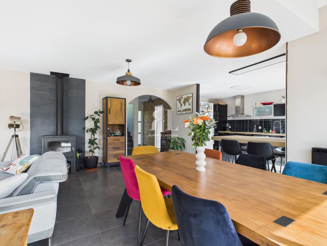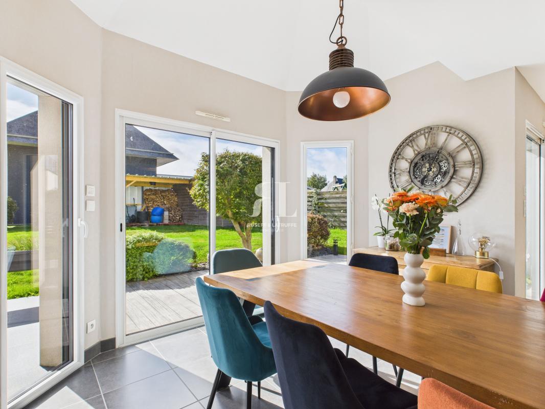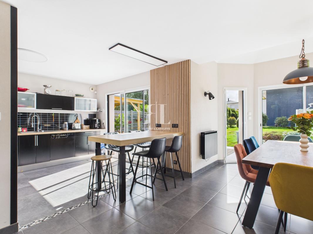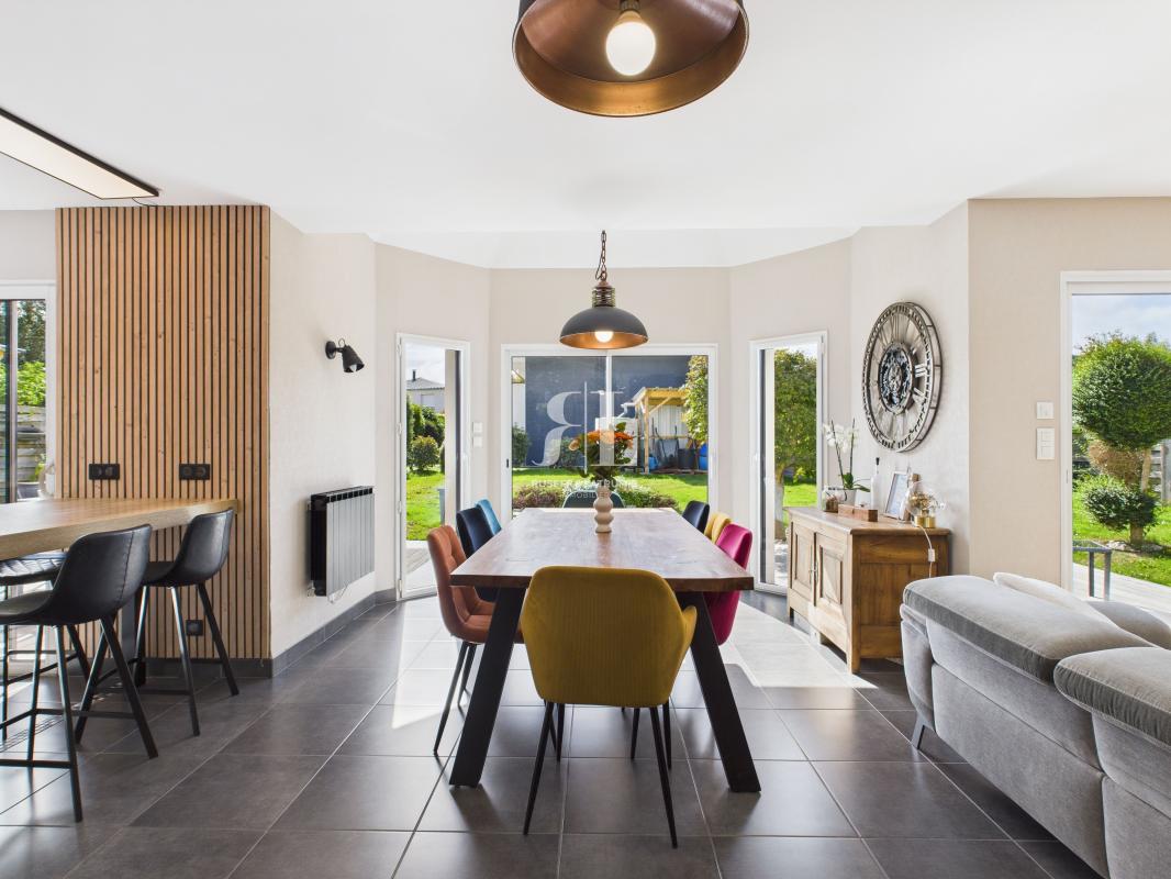 Dès l'entrée, vous êtes accueillis par une grande pièce de vie baignée de lumière, ouverte sur la terrasse et le jardin. Un espace convivial où l'on imagine déjà les repas partagés et les moments de détente.