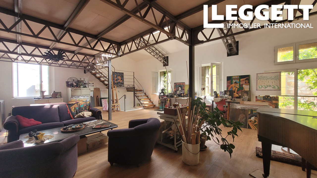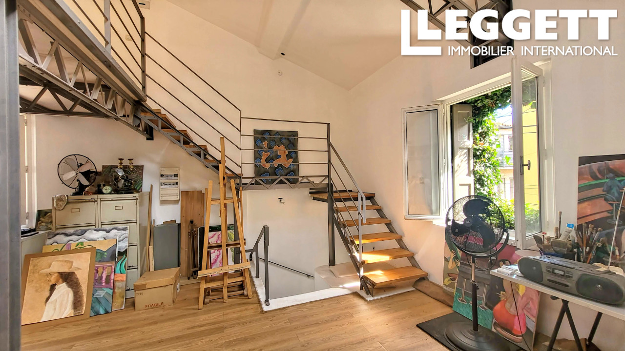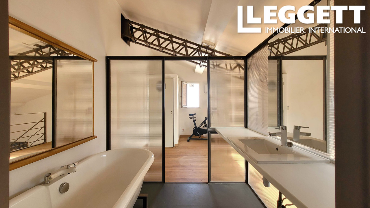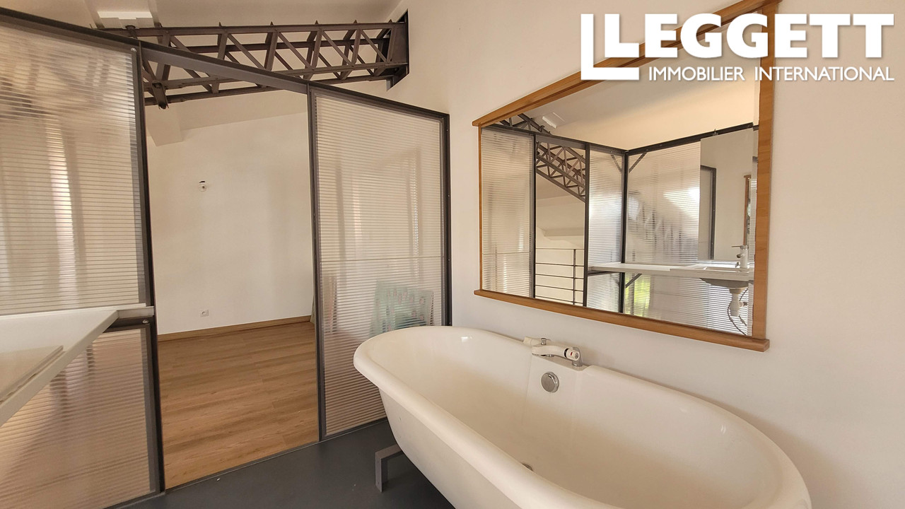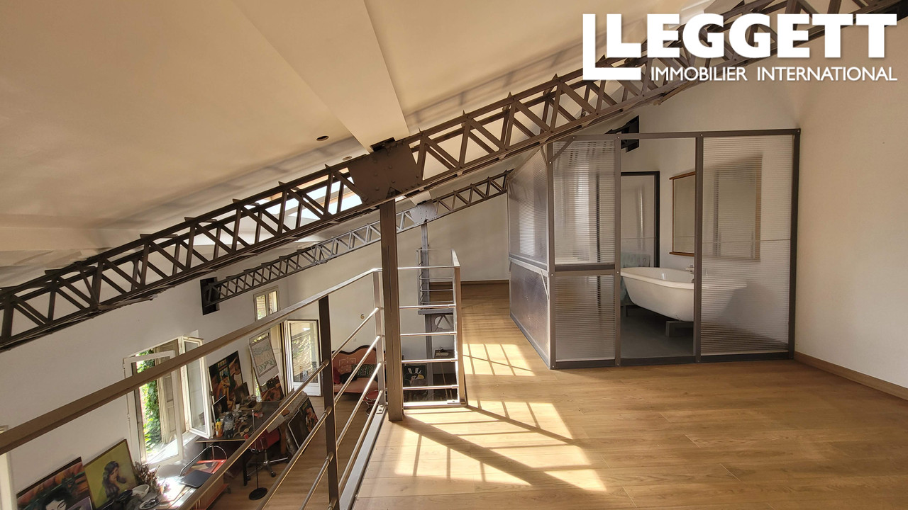 À l'étage : loft lumineux de 63 m² au style industriel, parquet en châtaignier, structure métal, salle de bain et WC séparés.