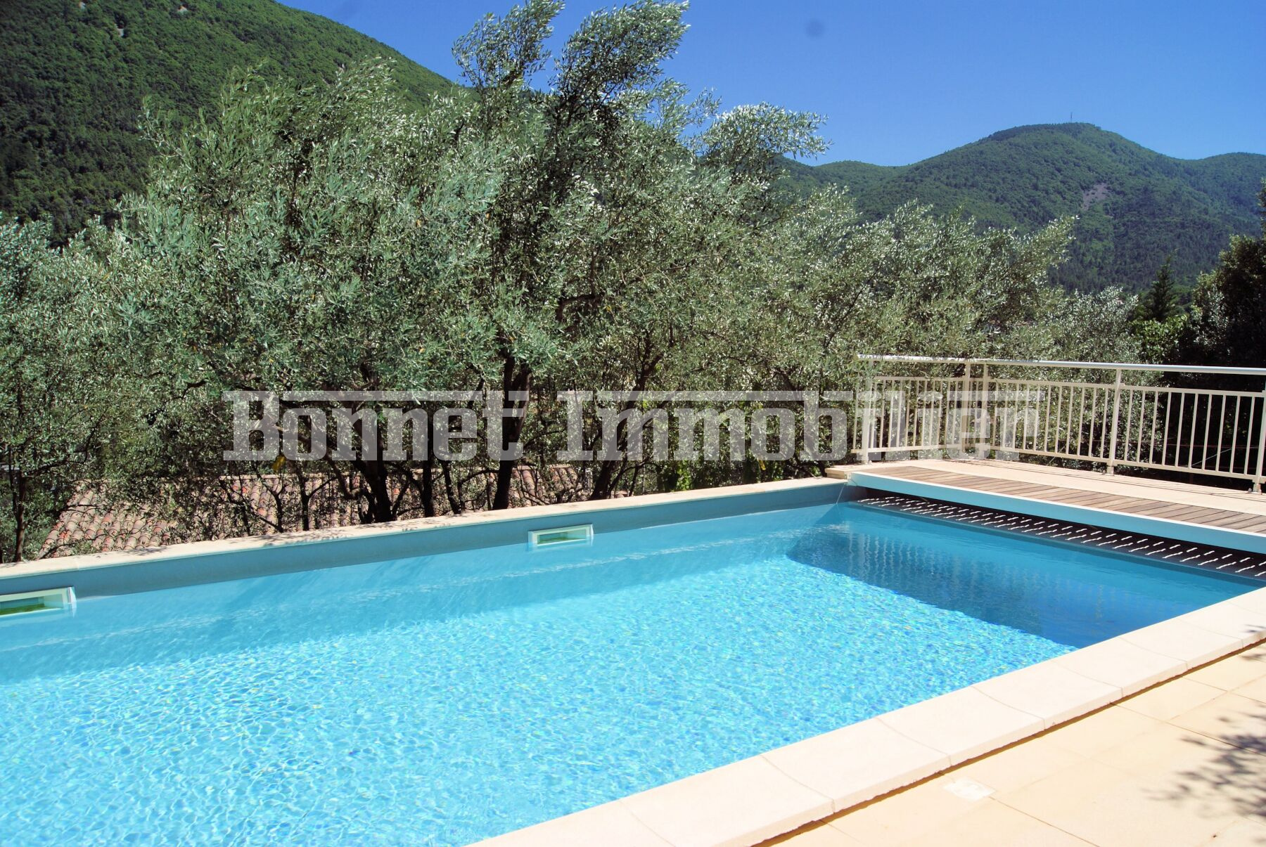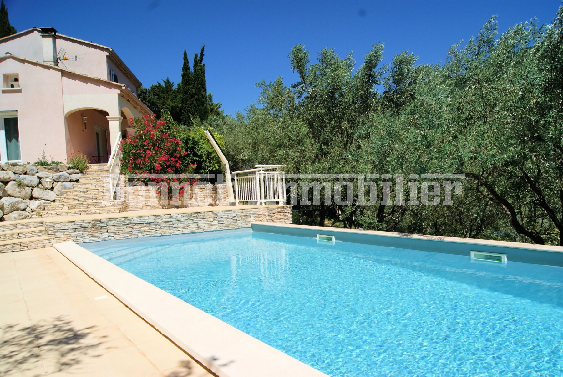 Terrain de 1500 m2 entièrement cloturé avec plusieurs oliviers, belle piscine de 9 x 4 m avec volet motorisé et pool house.