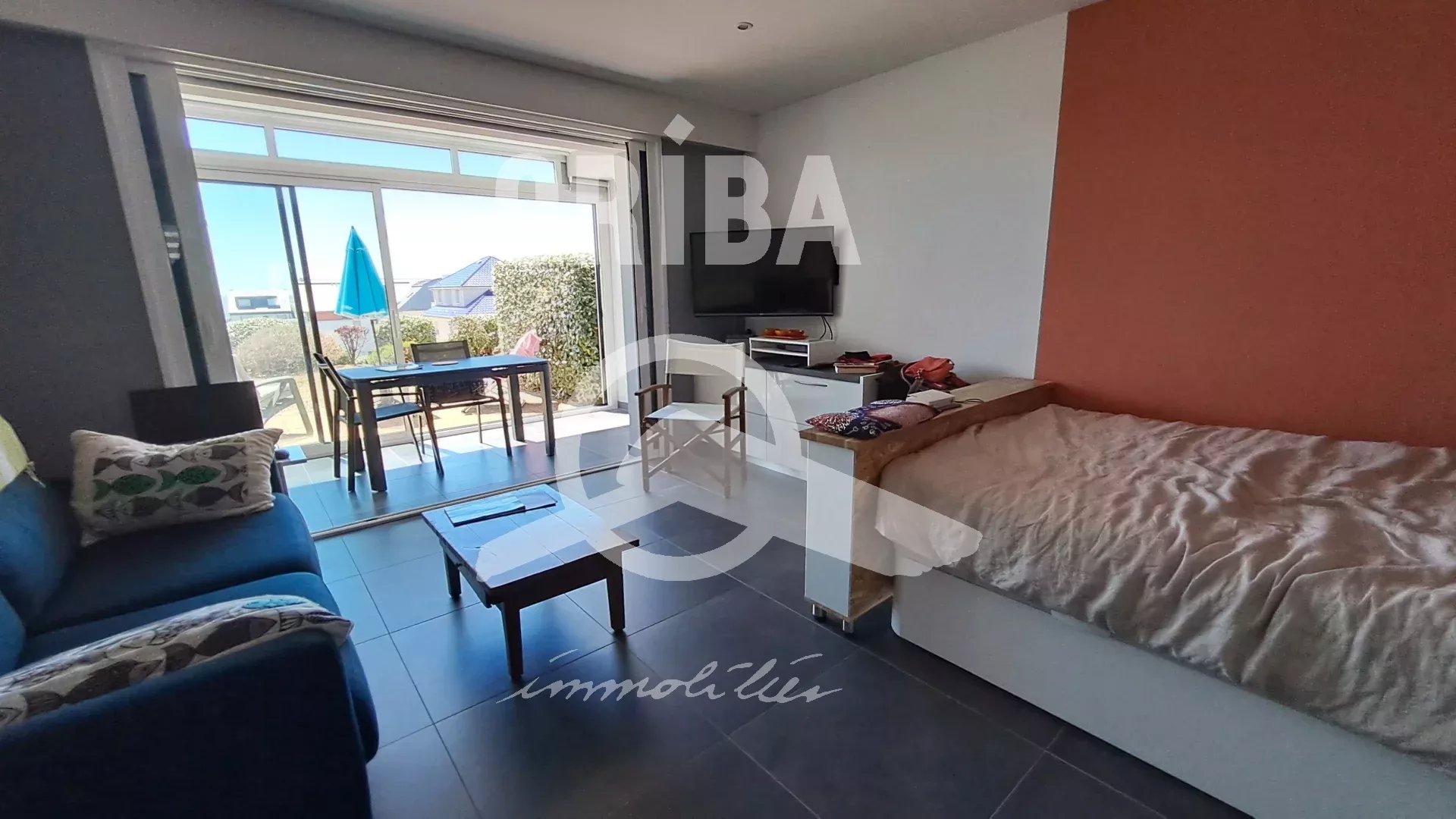 Appartement type studio de 33 m² environ en rez-de-jardin comprenant : entrée avec placard, cuisine aménagée et équipée, salon séjour, salle d'eau, wc séparé, véranda fermée, chauffage au sol. Terrasse de 11m². Une cave sur le palier et une place de stationnement sécurisé complète ce bien. Exposition sud-ouest, aperçu mer.