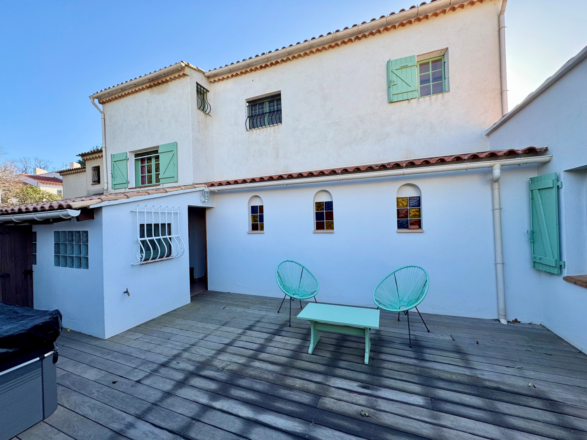 Au calme, proche des plages et du port du Brusc, cette villa de charme rénovée avec goût est nichée dans un écrin de verdure. Elle se compose d'une cuisine salle à manger donnant sur la terrasse au Sud, un double salon avec cheminée et bureau. A l'étage 3 chambres dont une suite parentale avec Salle de bain et WC, un bureau, une Salle d'eau avec WC, combles aménagées en 2 chambres. Une buanderie et une arrière cuisine situées coté nord. Vous apprécierez l'espace détente sans vis à vis avec son SPA à l'arrière de la maison. Un garage, un local à vélos et un studio complètent l'ensemble. Mitoyenneté d'un coté non génante. Produit rare, à voir sans tarder !!!