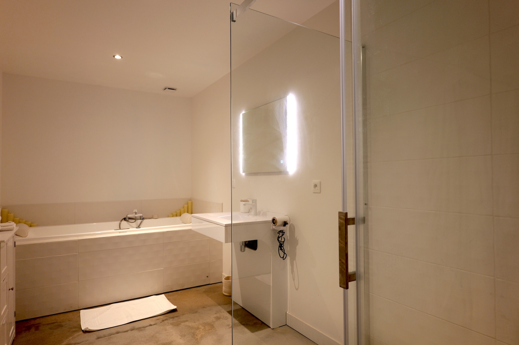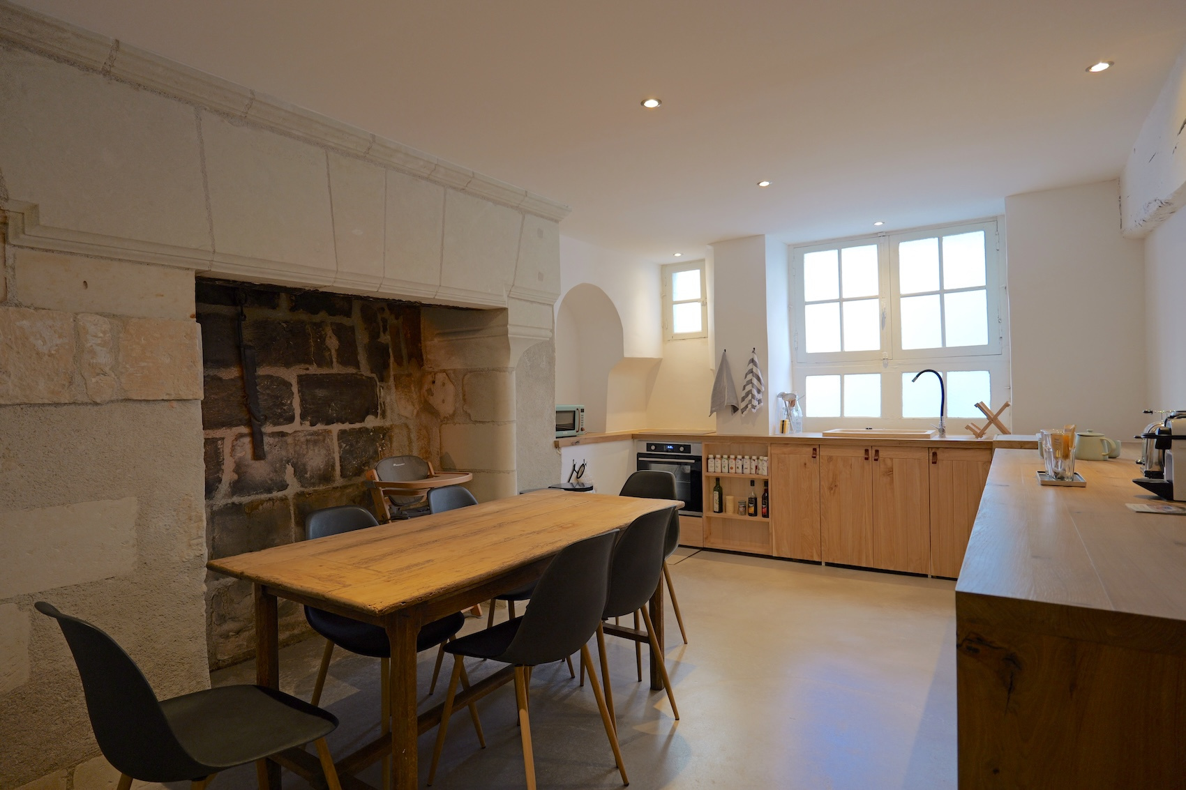 LA MAISON, environ 285 m2 Rez-de-Chaussée : Entrée avec très bel escalier à vis en pierre Appartement entièrement réaménagé d'environ 60 m2 composé d'une entrée, un séjour-chambre, une jolie cuisine avec cheminée XVIe avec four à pain, salle d'eau et WC Destiné actuellement à la location saisonnière (normes PMR), il communique par l'entrée de la maison, et est accessible indépendamment par la cour. Couloir conduisant à une jolie cave à vin de 2,50m x 4,70m et à une remise donnant sous la terrasse du séjour de l'étage Autre cave sous le jardin