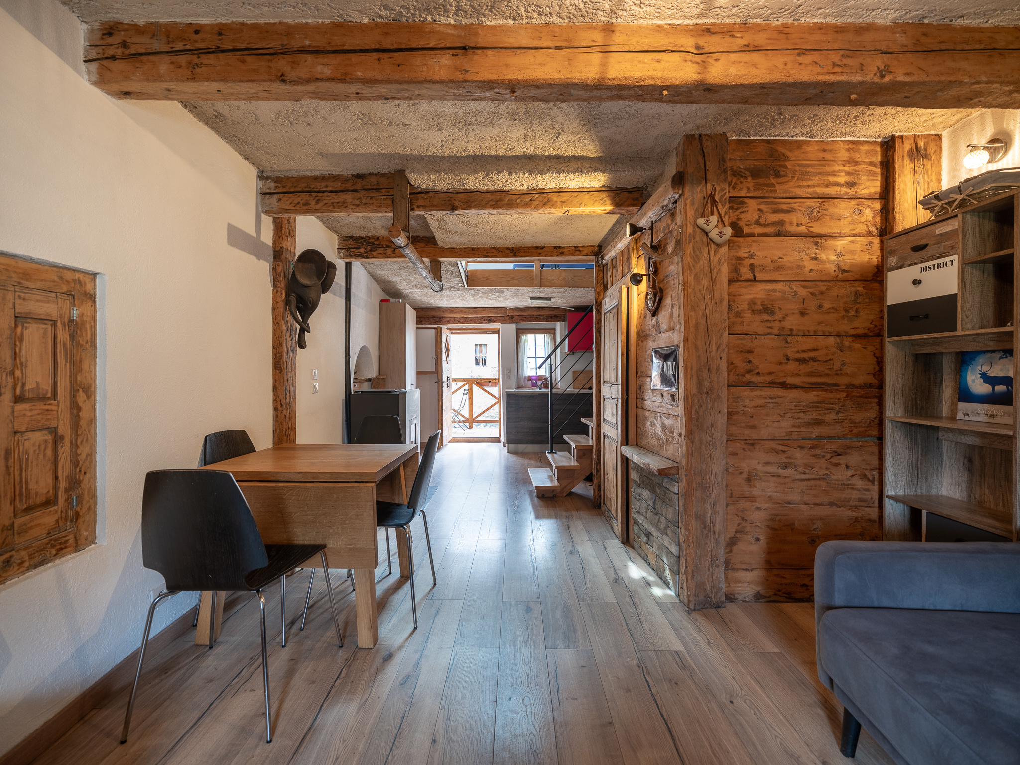 On y accède par un escalier en pierre et bois, un petit balcon agrémenté d'une table permet de prendre son café au soleil et de profiter de la sérénité de cet authentique village de montagne. La pièce de vie de 24m2 comprend une cuisine ouverte et un salon agrémenté d'un poêle à pellets, parfait pour créer une ambiance cosy les soirs d'hiver. A l'étage auquel on accède par un escalier en bois et métal, un pallier vous emmène à une chambre et une salle de bain/douche. Au passage profitez d'une jolie vue sur la Tournette.