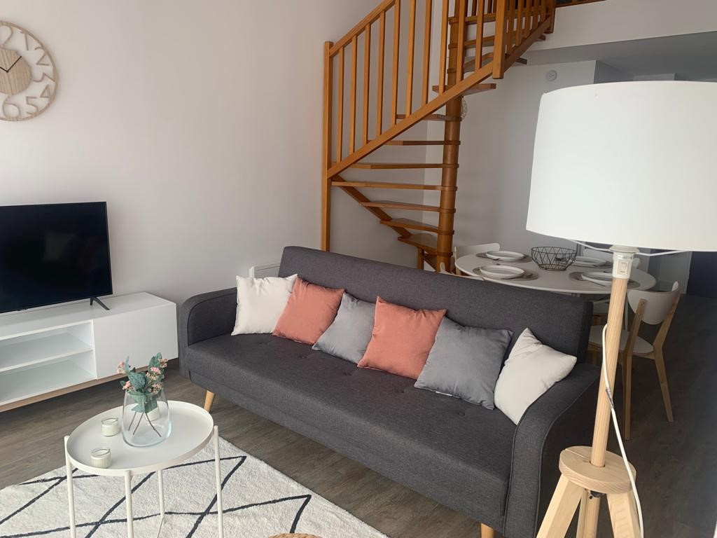 Séjour lumineux de 28 m2 avec cuisine moderne entièrement équipée (four, plaques, hotte, micro-ondes, réfrigérateur-congélateur et petit électroménager, canapé, meuble avec télévision...).