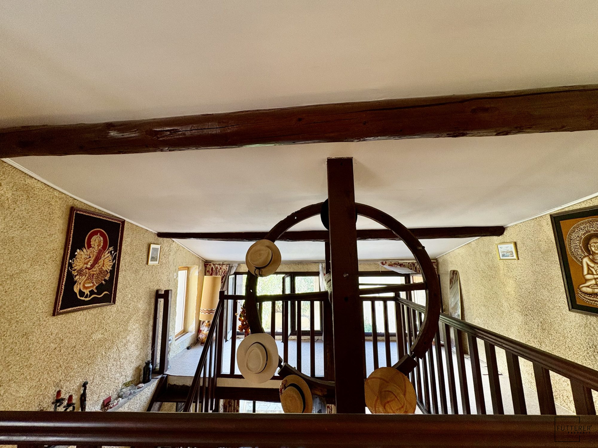 À l'étage, une mezzanine de 34 m² aux poutres apparentes vous surprendra par son volume et son caractère. Ce lieu polyvalent, à la fois lumineux et chaleureux, peut être aménagé en salon de lecture, salle de jeux ou coin détente. Cet étage dessert également trois chambres en enfilade, un bureau et une salle d'eau avec sanitaire.