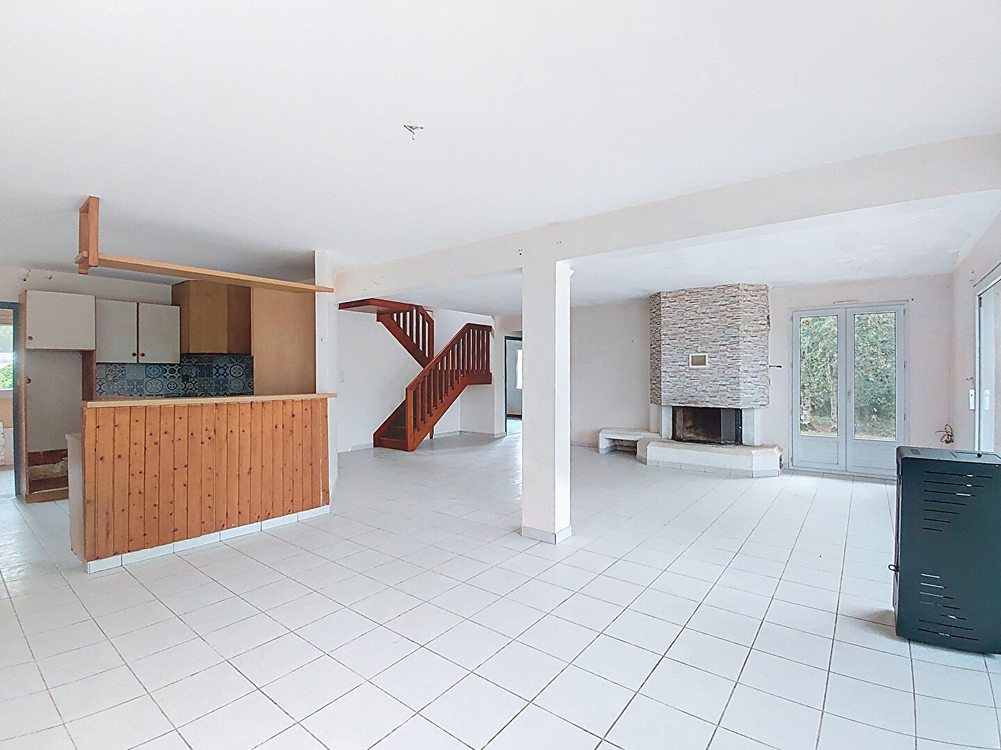- Au rez-de-chaussée : Un grand salon lumineux de 65 m² avec cuisine ouverte et poêle à granulés, une arrière cuisine, deux chambres, un bureau, une salle de bains, wc