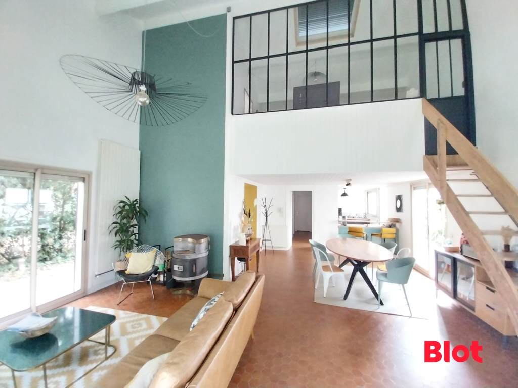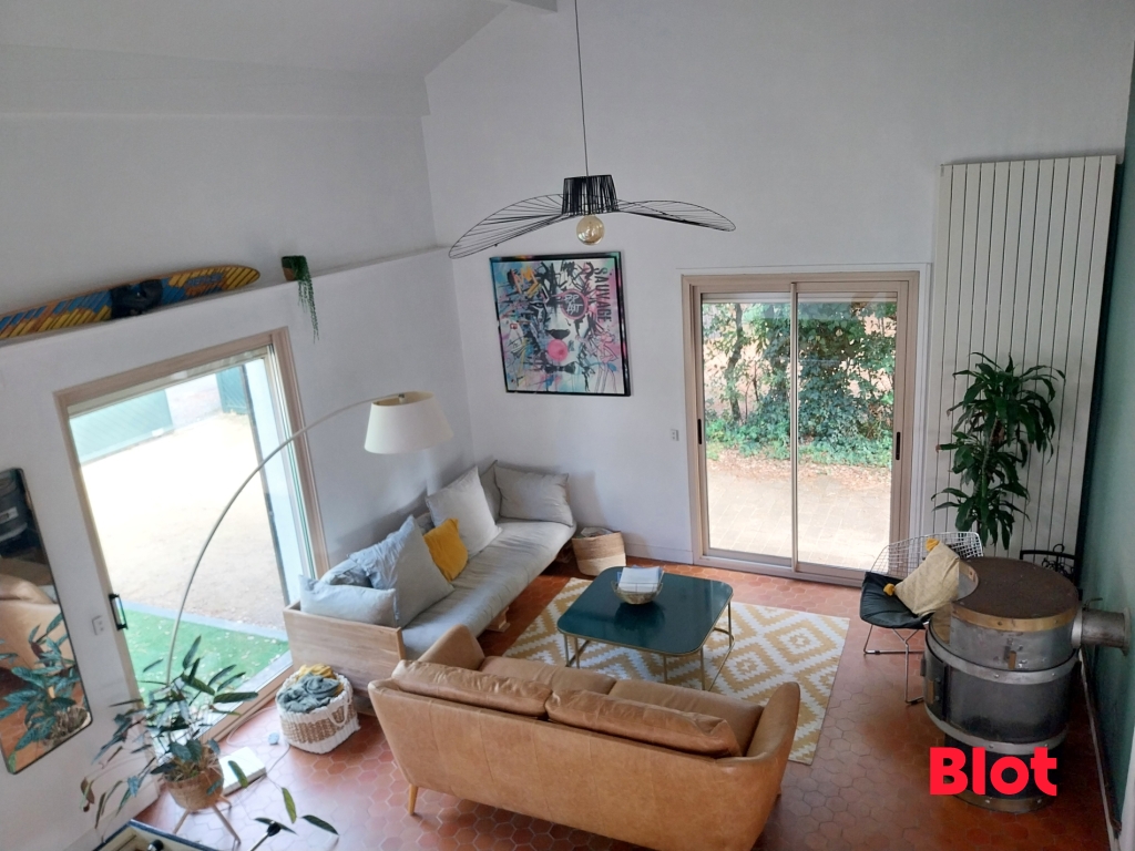 L'intérieur surprend par ses volumes et sa luminosité . La grande pièce de vie avec sa belle hauteur sous plafond et sa cuisine semi ouverte a un véritable cachet, style loft.