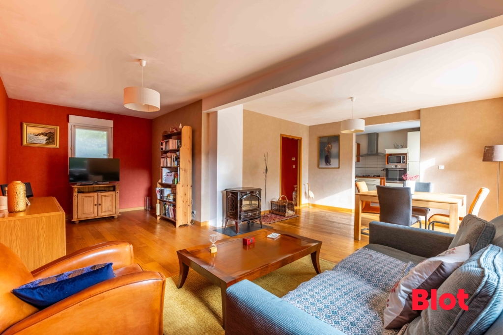 Dès l'entrée vous serez séduit par son beau parquet bois massif qui se prolonge dans toute la pièce de vie. Vous apprécierez ce grand salon séjour de plus de 38m² avec poêle à bois.