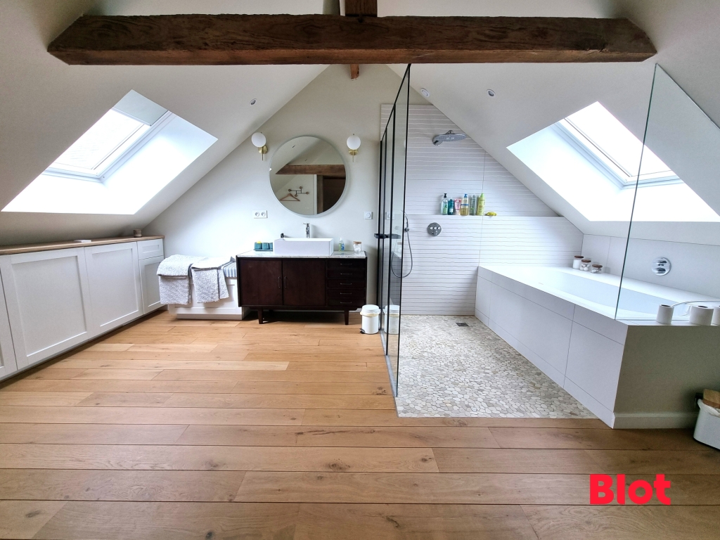 Au premier étage, deux grandes chambres, dont l'une avec salle d'eau privative, et une superbe suite parentale récemment aménagée avec chambre, dressing et salle de bains (douche & baignoire), vous offrent tout le confort nécessaire.