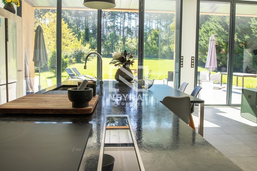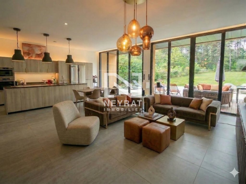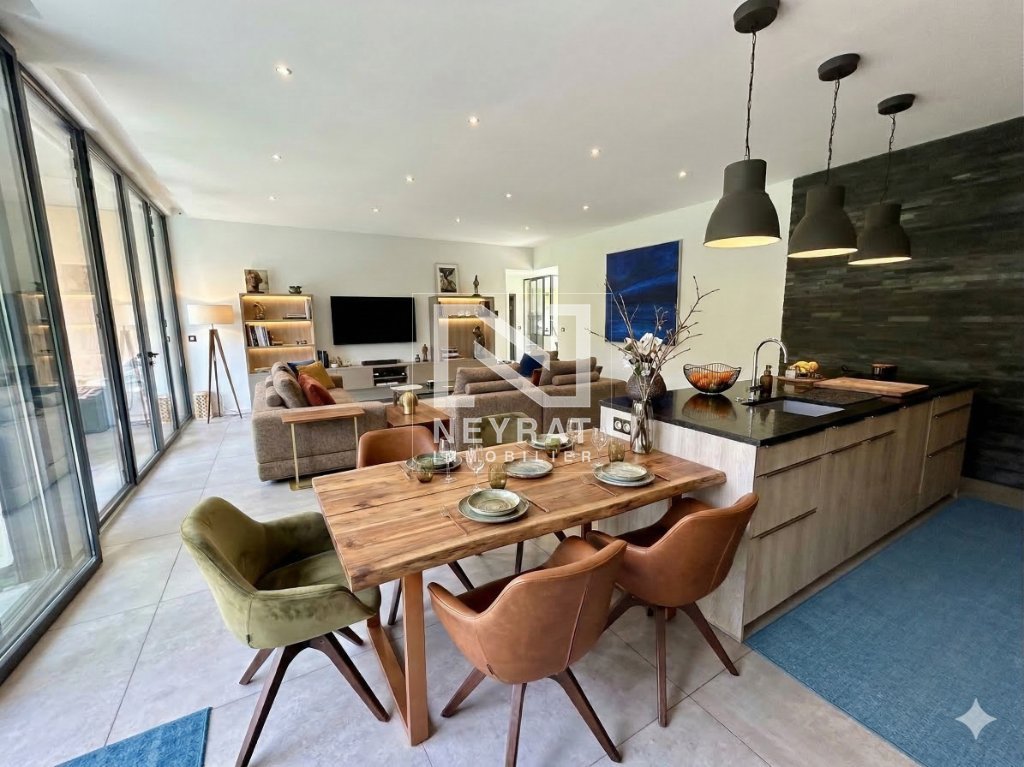Espaces de Réception et Lumière La vaste pièce de réception, baignée de lumière traversante grâce à d'immenses baies vitrées en triple vitrage, offre une continuité parfaite avec les terrasses et le jardin. La cuisine dinatoire, aux lignes épurées et équipements haut de gamme, s'intègre harmonieusement à cet espace de convivialité.