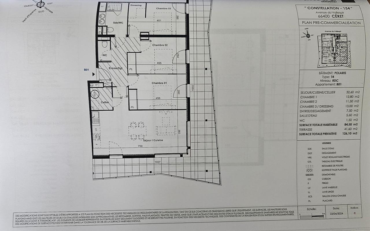 A Céret, situé sur la friche de l'ancienne gare dans une résidence de standing, venez découvrir ce bel appartement T4 (RE 2020 ) situé au 3e étage de la résidence CONSTELLATION 154, d'une superficie habitable de 90 m2 bénéficiant d'une belle terrasse de 75 m2 orientée Sud-est.