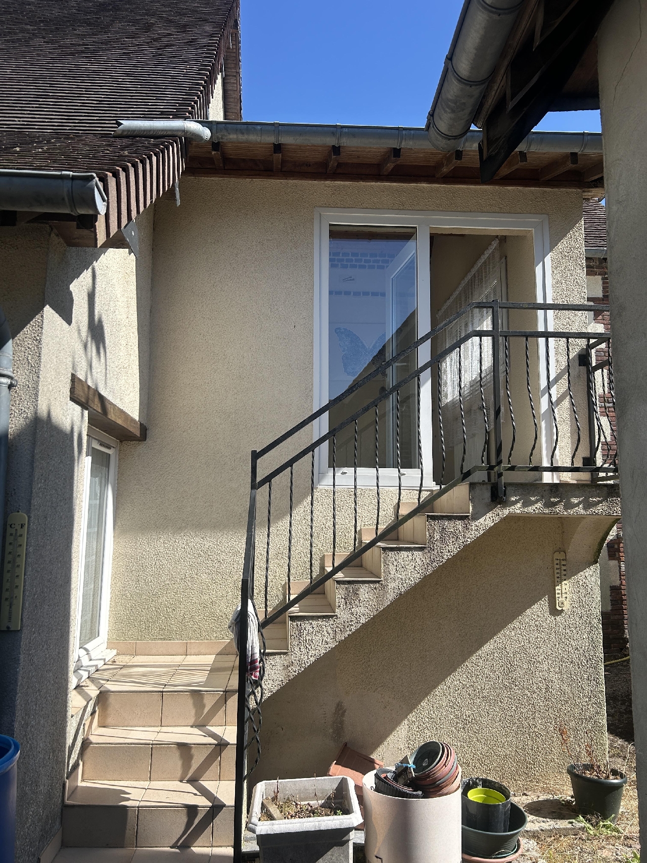 Maison de ville : Entrée, pièce à vivre avec cuisine, chambre, salle d'eau, wc, sas. Etage : couloir desservant 2 chambres, salle de bains, wc. Chauffage central gaz de ville . Sous-sol. A l'écart bâtiment avec grenier. Cour. Terrain non attenant.