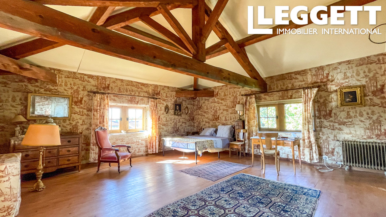 Deuxième étage : deux autres chambres de 41m² avec plafonds cathédrale à poutres apparentes et rangements intégrés.