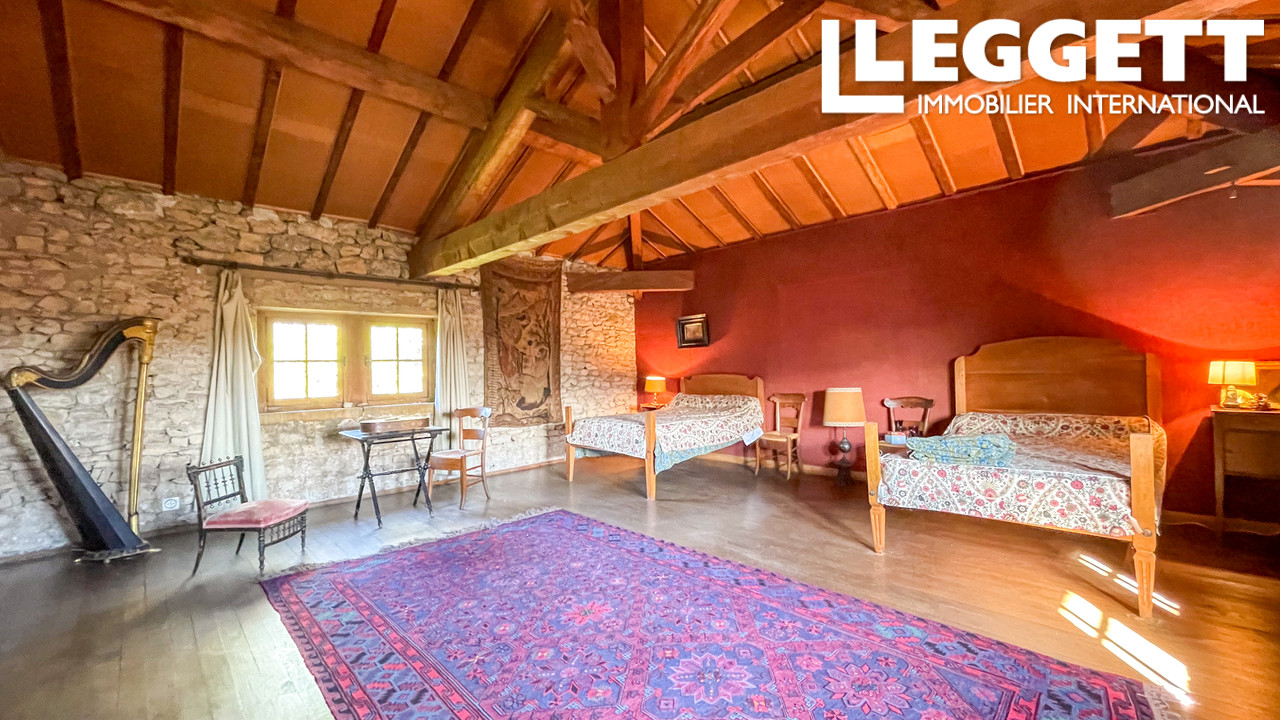 Premier étage : deux belles chambres de 41m² avec portes authentiques, cheminées d'époque et plafonds à caissons remarquables.