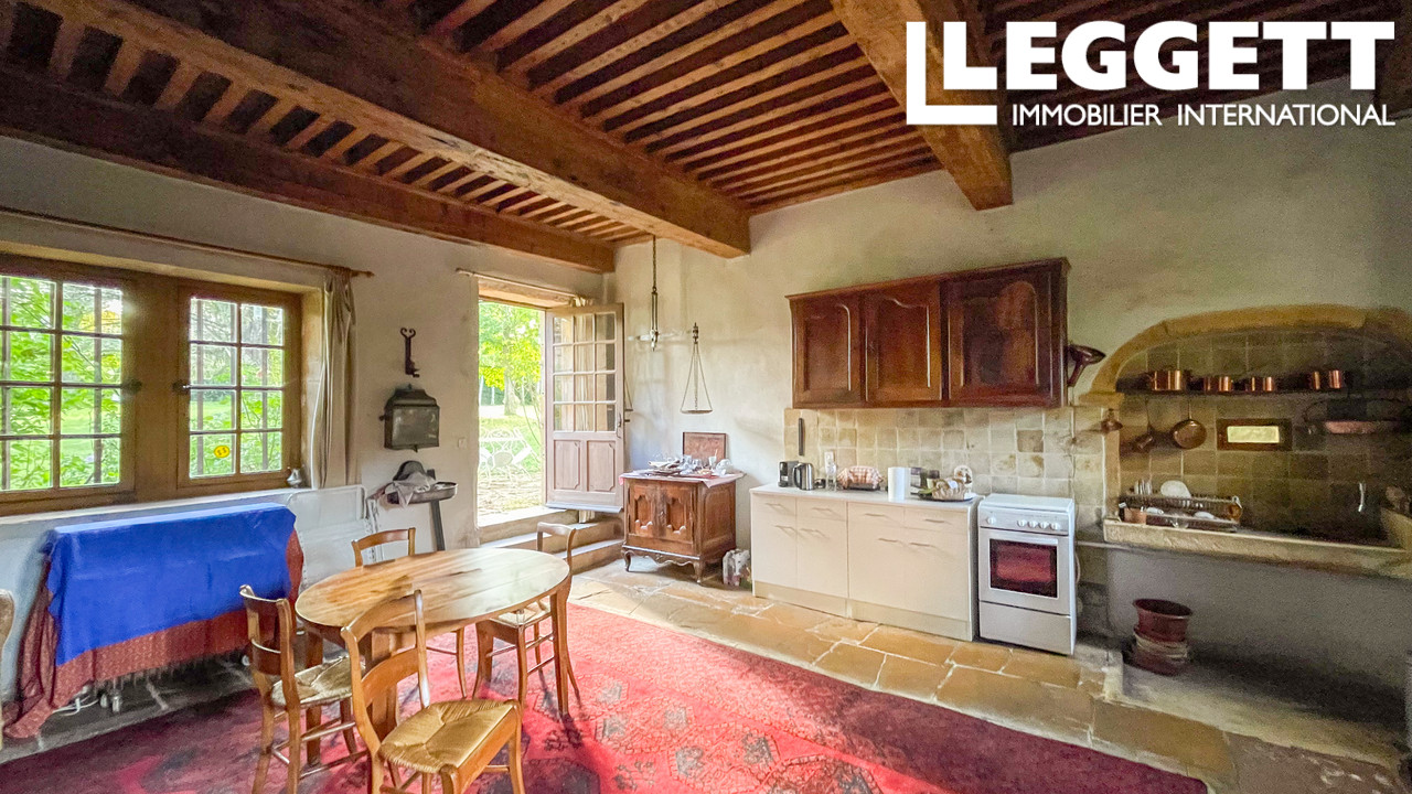 Rez-de-chaussée : salon de 41m² au sol carrelé avec accès cave voûtée, cheminée monumentale en pierre dorée et fresques en trompe-l'oeil. Cuisine-salle à manger de 41m² conservant sol, cheminée et évier d'origine en pierre dorée.