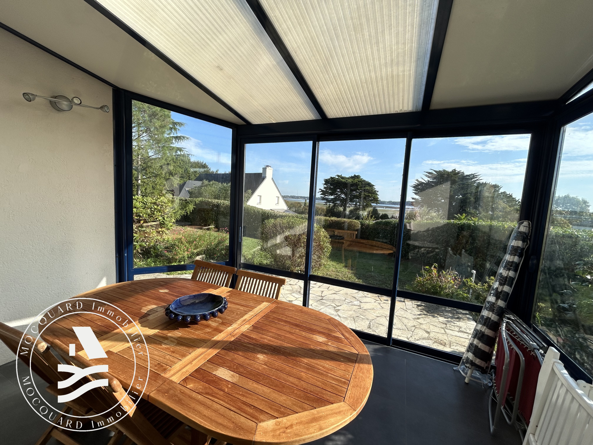 Sa situation privilégiée offre une superbe vue sur le Golfe du Morbihan, que l'on peut admirer depuis la cuisine, la pièce de vie prolongée par une véranda lumineuse ainsi que depuis les chambres.