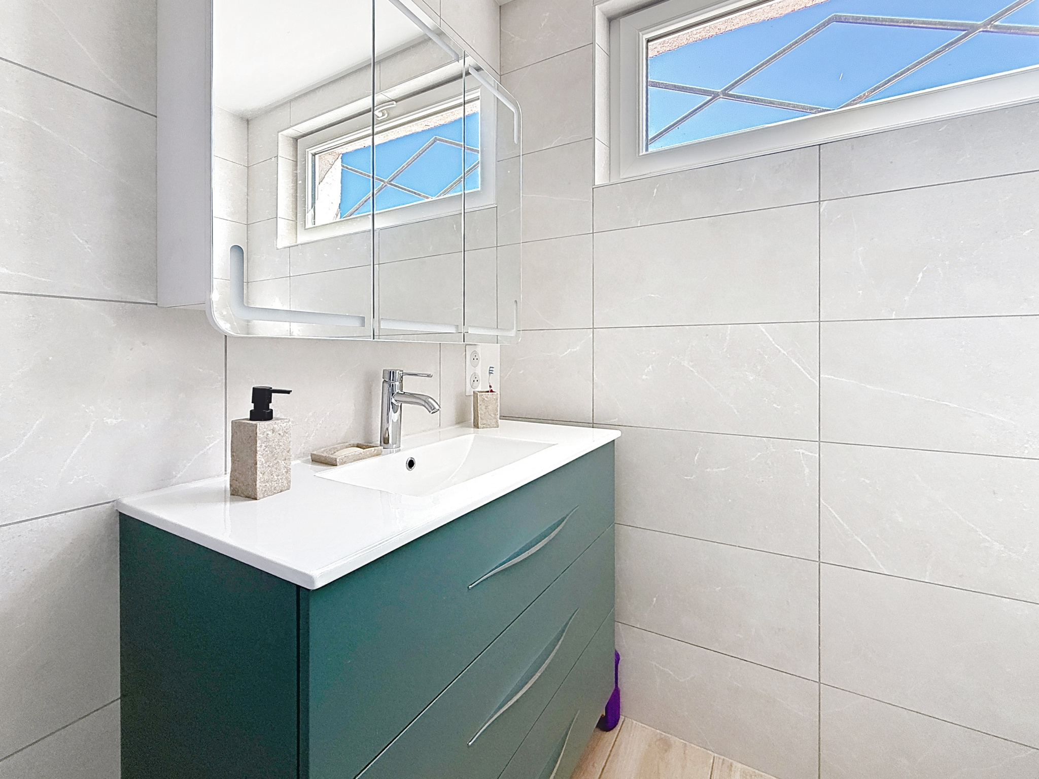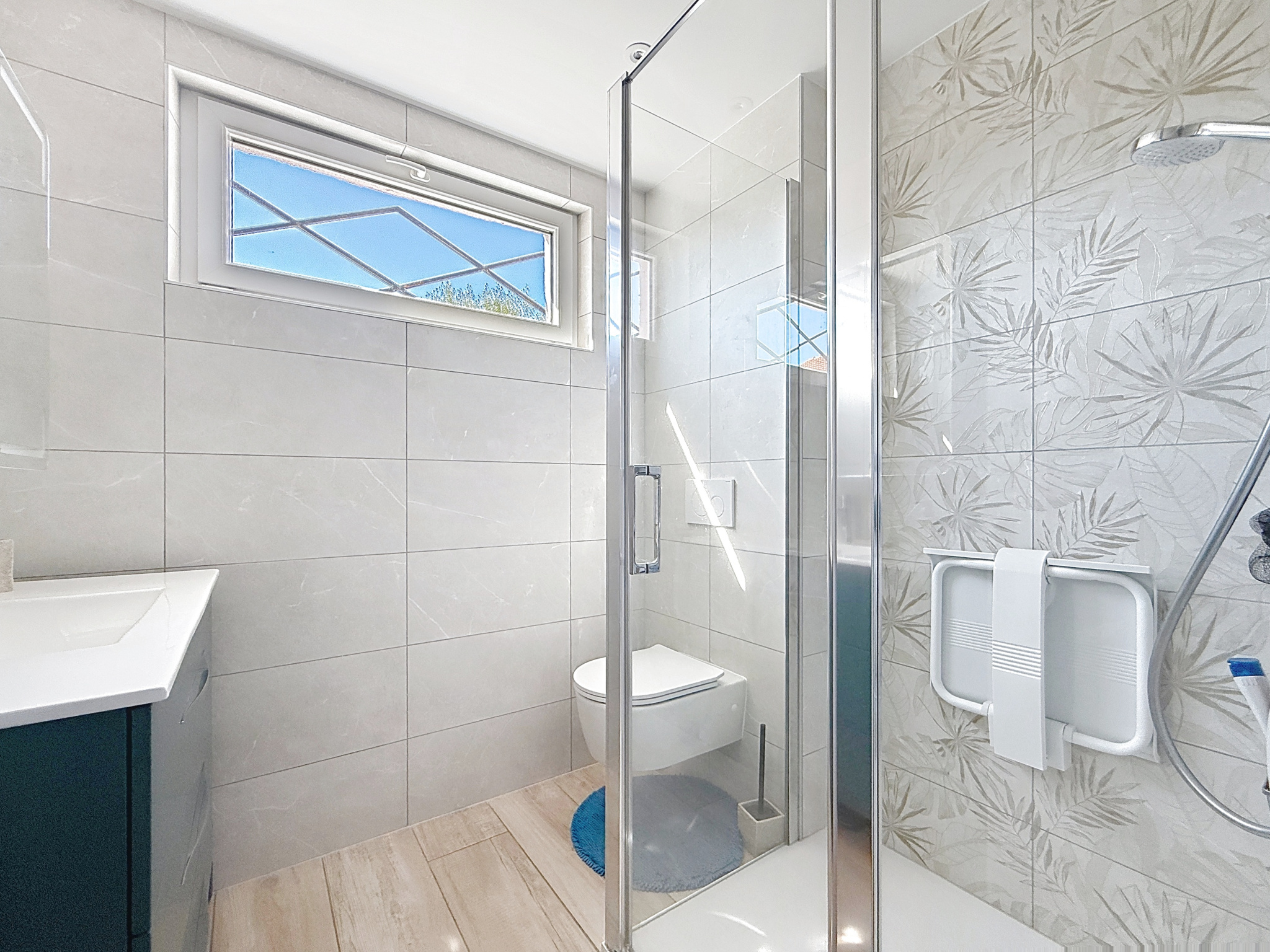 Cette maison se compose au rez-de -chaussée d'une entrée, d'un salon agéable, d'une salle à manger lumineuse, une cuisine aménagée et équipée , un bureau parfait pour le télétravail ou pour une chambre d' appoint.