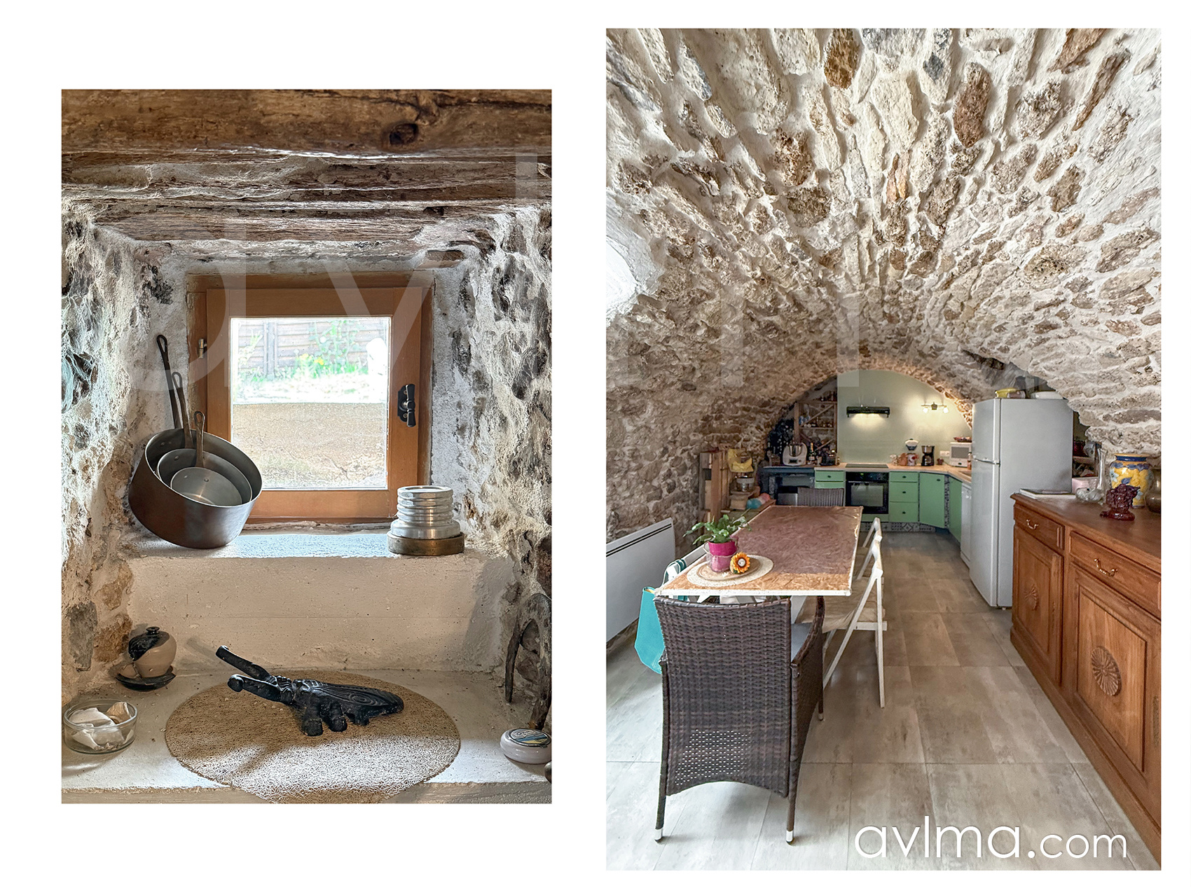 - Au rez-de-chaussée, vous serez séduit par une magnifique cave voûtée transformée en cuisine conviviale, ainsi qu'une pièce de vie chaleureuse sublimée par une cheminée.